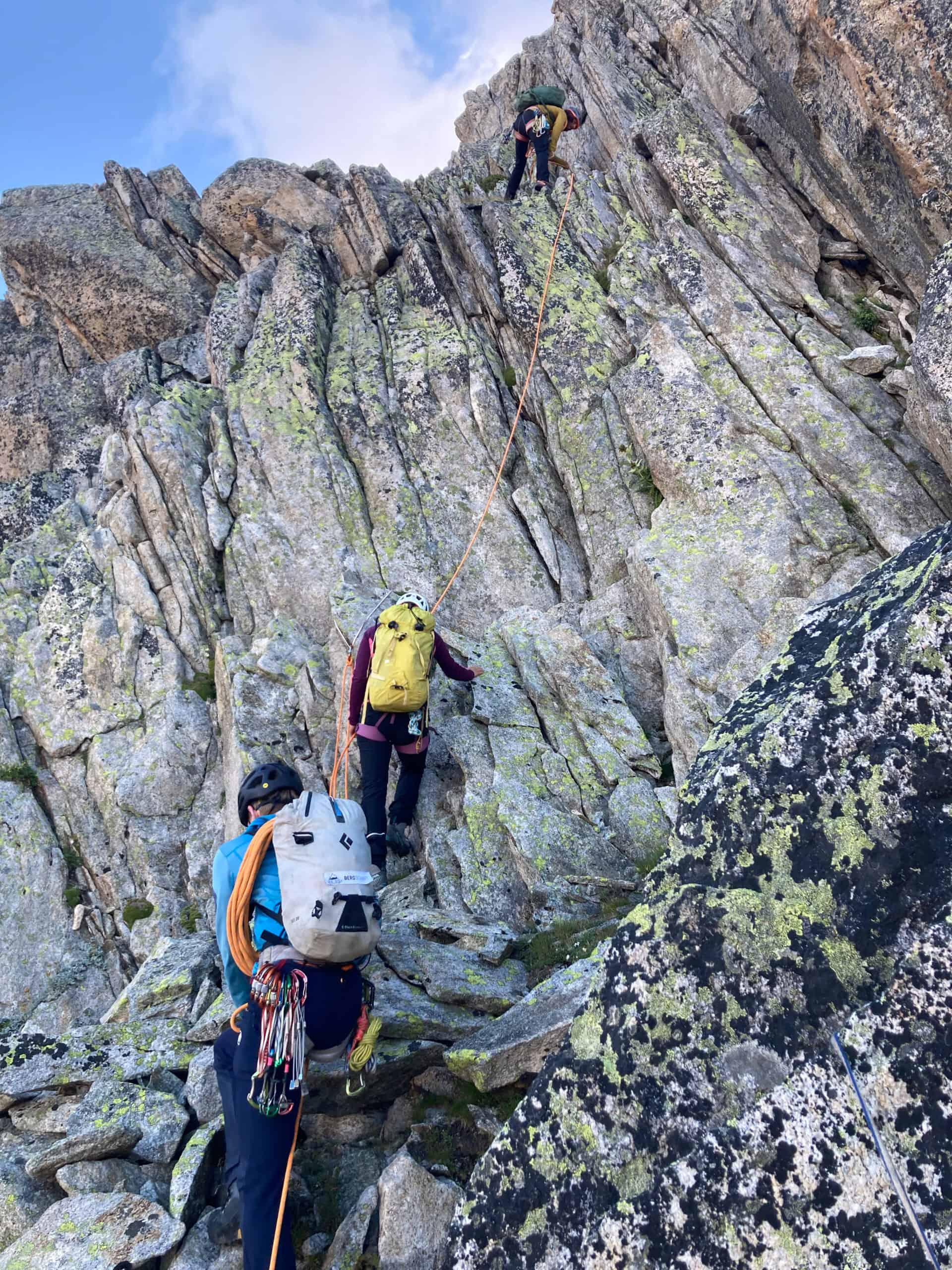 Heute kommt die erste Perle: wir starten bei Morgengrauen und gehen im Morgenrot zum Einstieg vom Brandlammhorn Südgrat. Hier geht es sogleich los, die ersten 3 Seillängen haben Wandkarakter und in toller Kraxelei geht es auf den Grat. Hier begrüsst uns die Sonne und lädt zu einer Rast ein. Gemeinsam geht es auf dem scharfen Grat weiter. In bestem Granit überklettern wir in einfacher Kaxelei mehrer kleine Türme und gelangen so auf den Gipfel. Wir geniessen hier die grandiose Aussicht und den Blick zurück zur Lauteraarhütte, Stefan von der Lauteraarhütte macht oft ein Gipfelfoto von uns durch das Fernrohr :D. Der Abstieg führt zuerst über den Grat weiter nach Norden, bevor es mehrer Abseilstellen gegen Osten gibt. Nun gelangen wir in einfacheres Gelände und schreiten fröhlich und mit genialen, neuen Eindrücken zur Bächlitalhütte. Nach einem langen Tag geniessen wir hier die Abendstimung und das leckere Abendessen.