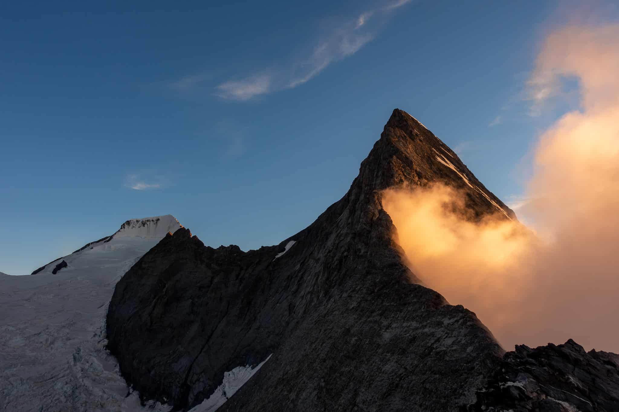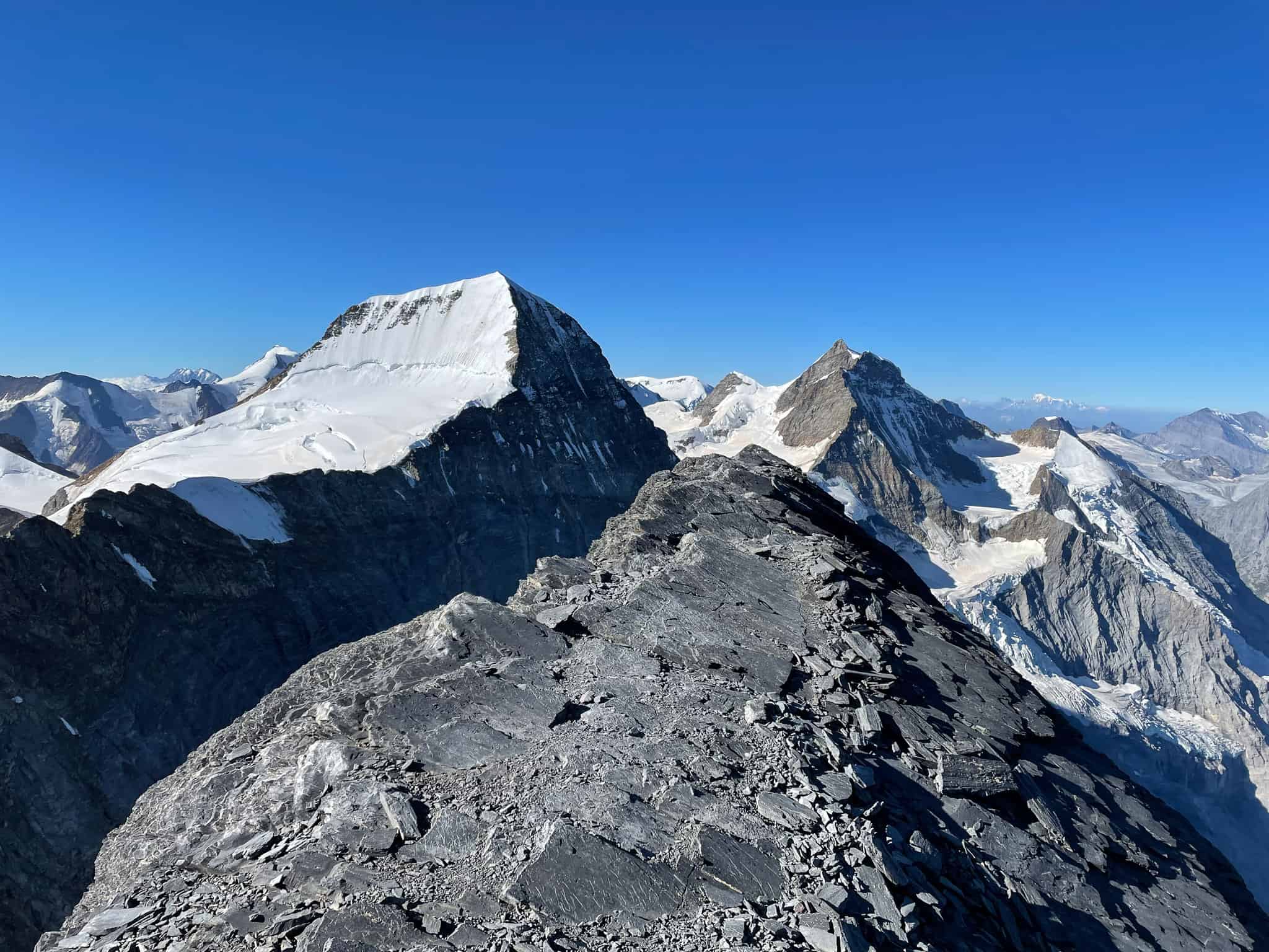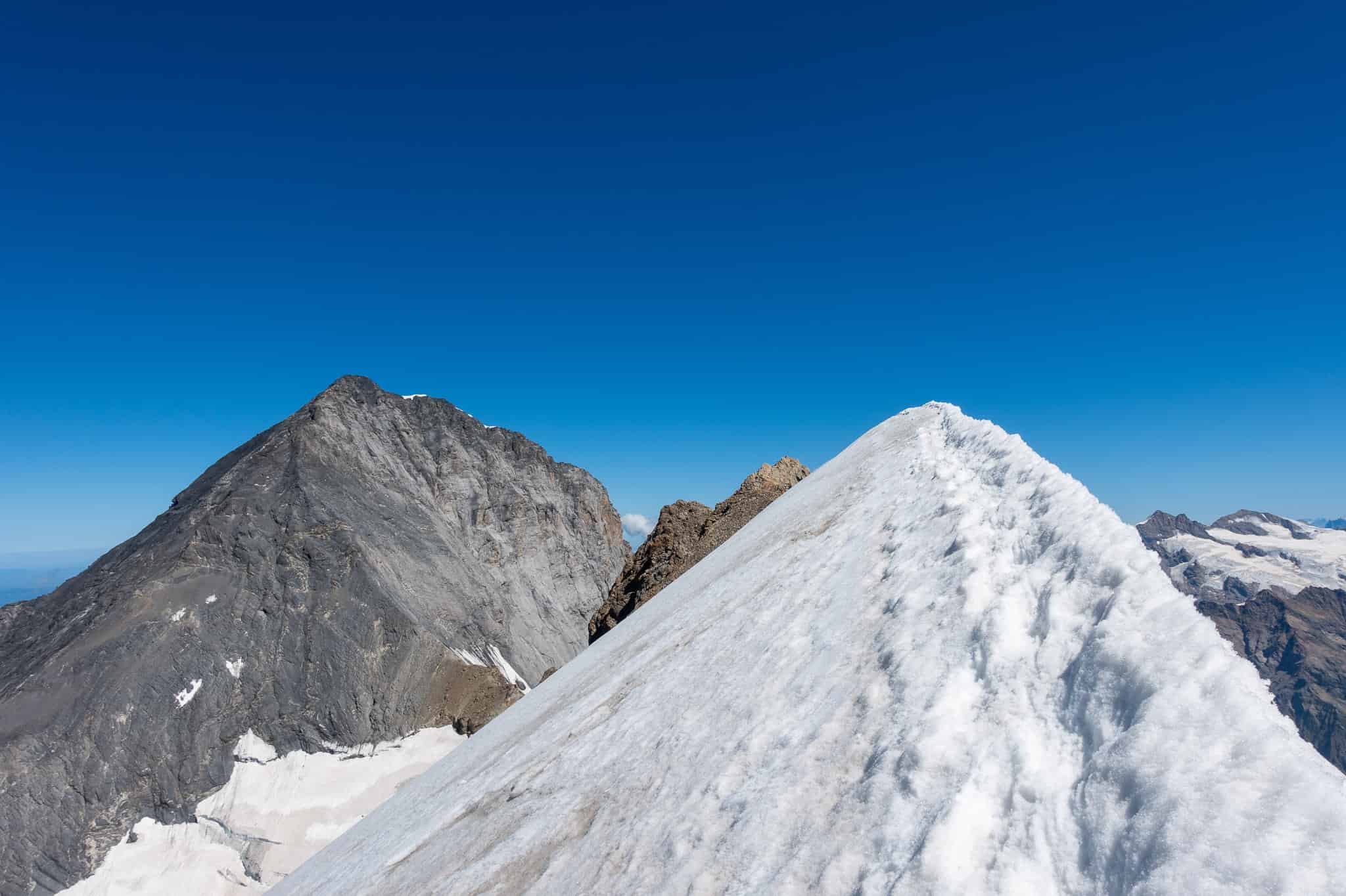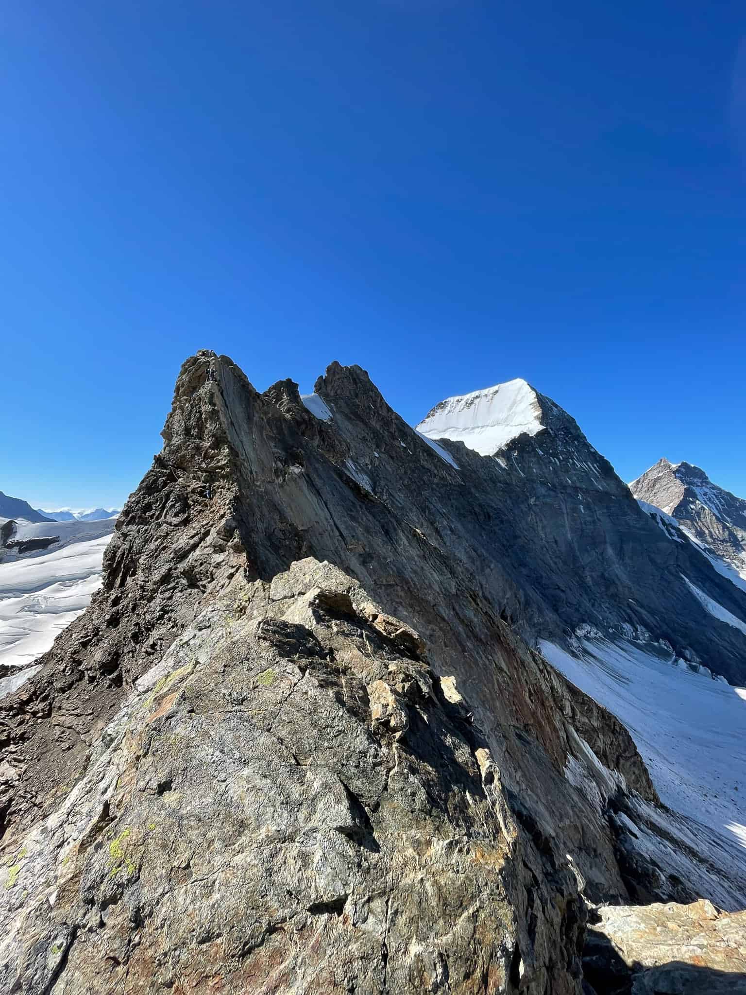 Der Mittellegigrat ist einer der eindrücklichsten Grate. Stets fällt die Eigernordwand rechts steil ab. Man blickt direkt nach Grindelwald und weiter in die grüne Voralpenlandschaft mit ihren Seen und Hügeln. Auf der anderen Seite die vergletscherte Hochgebirgswelt aus Fels, Schnee und Eis. Kontrastreicher und eindrücklicher geht es nicht. Der Grat selbst ist super zu klettern und ein Erlebnis der Superlative.