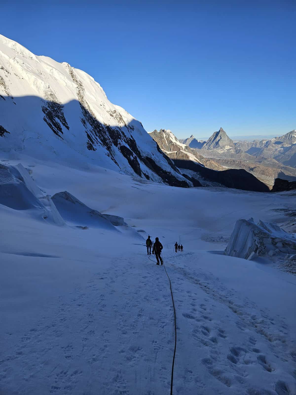 Unser Abschlusstag geht eventuell noch auf die Zumsteinspitze 4563 m, “gleich” oberhalb der Hütte, bevor wir dann über den eindrücklichen Grenzgletscher zur Monte Rosa Hütte 2798 m absteigen. Über einen Klettersteig und den Gletscher geht es zur Gornergratbahn auf den Rotenboden. Wir nehmen gemeinsam die Bahn zurück nach Zermatt.