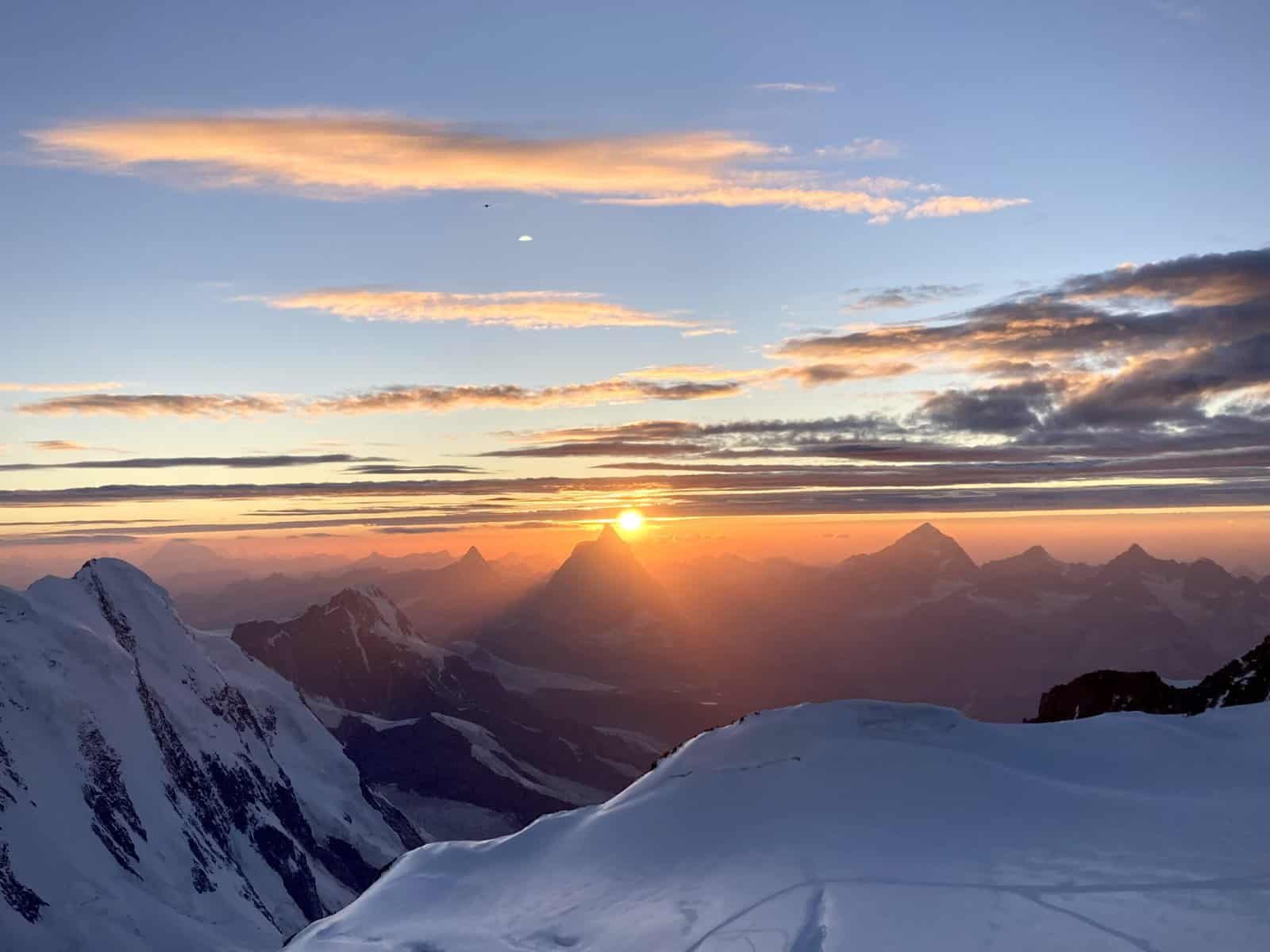 Wir fahren mit der Bahn hoch auf das Klein Matterhorn und machen die Tour auf das Breithorn (4164 m). Von dort geniessen wir die Aussicht von unserem ersten 4000er. Anschliessend steigen wir zur Rifugio Guide d`Ayas ab, wo wir übernachten.