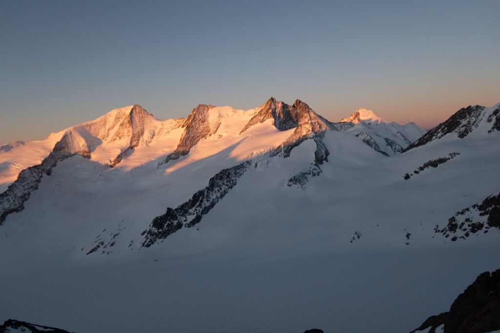 Skihochtouren auf riesigen Gletscher im April und Mai ist genial. Es macht einfach Spass, über die verschneiten Gletscher in der Morgendämmerung aufzusteigen, auf einen stolzen Gipfel zu kommen und danach über die schönen Hänge und flachen Gletscher zurück zu gleiten. In diesen 2 Tagen, nehmen wir dich mit auf zwei tolle Skihochtouren vom Jungfraujoch aus und zeigen dir dabei auch, auf was du achten musst und wie man sich auf den Gletschern und Skihochtouren verhält. Wir treffen uns in Grindelwald und können dank den Bahnen gleich in die Hochgebirgswelt eintauchen. Wir starten mit einer gemütlichen Tour über das Louwihorn und geniessen eine grandiose Abfahrt quer durch den Gletscher. Wir übernachten in der grandios gelegenen Hollandiahütte und steigen von dort am nächsten Tag auf die Äbeni Flue auf fast 4000m. Hier geniessen wir einen grandiose Aussicht auf die 4’000er vom Berner Oberland. Danach geht eine lange Abfahrt runter ins Lötschental!