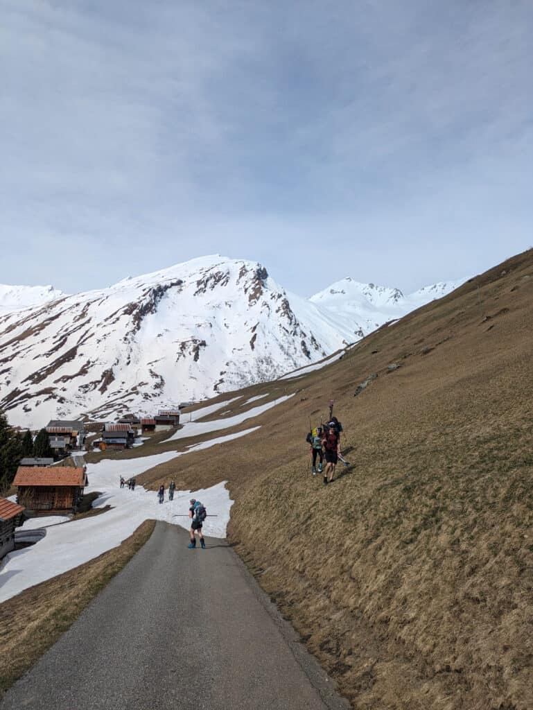 - Zusätzlich gibt es Abschnitte, wo wir die Skis tragen und durch den Schnee stapfen.