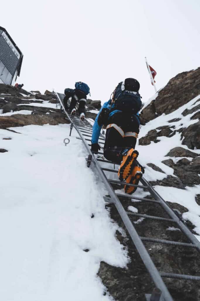 The long ladder up to the Bertolhütte is not everyone's cup of tea either. Joni Hedinger estimates it at over 50 metres. It goes without saying that you need to be free from vertigo on the Haute Route, even if there are no very extreme climbing sections. But every now and then you have to scramble up steep snow flanks in ski boots and with your skis on.