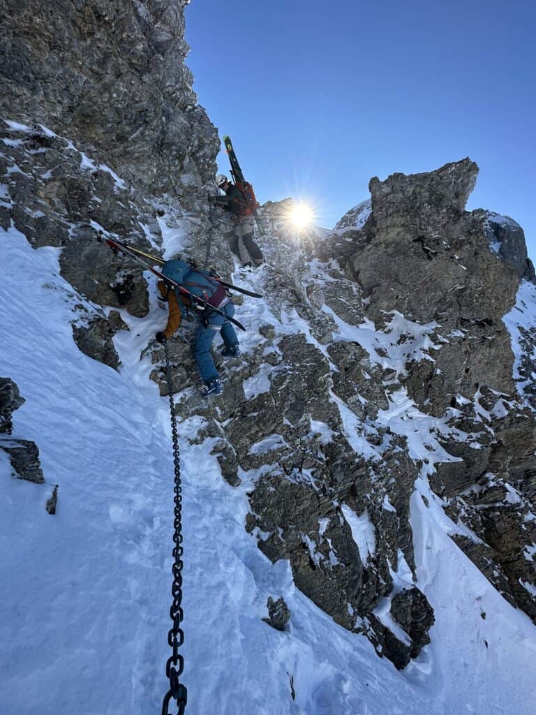 I was one of the participants in the group led by mountain guide Aspirant Julian on this glorious day. The tour had been on my wish list for a long time. But concerns about the abseiling point held me back from attempting the tour on my own. Anyone who has ever travelled in alpine terrain knows that the right company makes all the difference. When the tour was advertised by Bergschaft under their "spontaneous tours", I knew that this was the ideal opportunity to benefit from their expertise and leadership skills. Their support gave me the security I needed and also the mental freedom to concentrate on the impressive landscape and enjoy the experience to the full. From the first track in the snow to the via ferrata and the abseil, the tour was varied, exciting and at the same time very fulfilling.