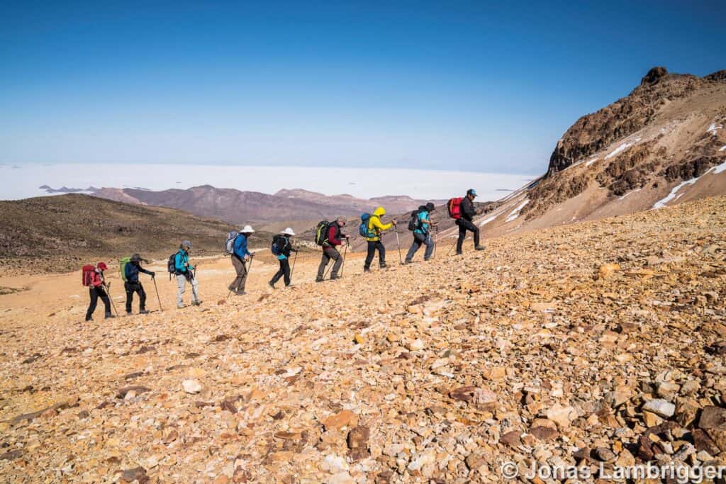 - Fitness and health for hikes of approx. 3 hours pure hiking time on the ascent and approx. 1.5 hours on the descent. This information refers only to the hikes, but does not include mountain hikes/climbs on the two technically easy 6000 metre peaks.
