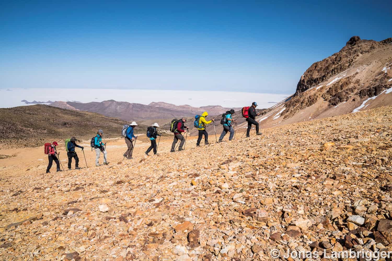 - Cerro Acotango (6052m above sea level) - Mountain hike: Pure "walking time", approx. 4h ascent (700m) and approx. 2h descent (700m) on (mountain) hiking trails, partly pathless terrain, possibly a short section with crampons.