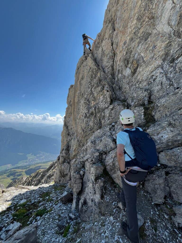 The traverse goes over several towers. Each of these is an easy climb (2nd to maximum 3rd degree). We also reach a tower with a summit register from 1947 😉 We abseil down from the Napoleon tower. Here you will be lowered by the mountain guide.