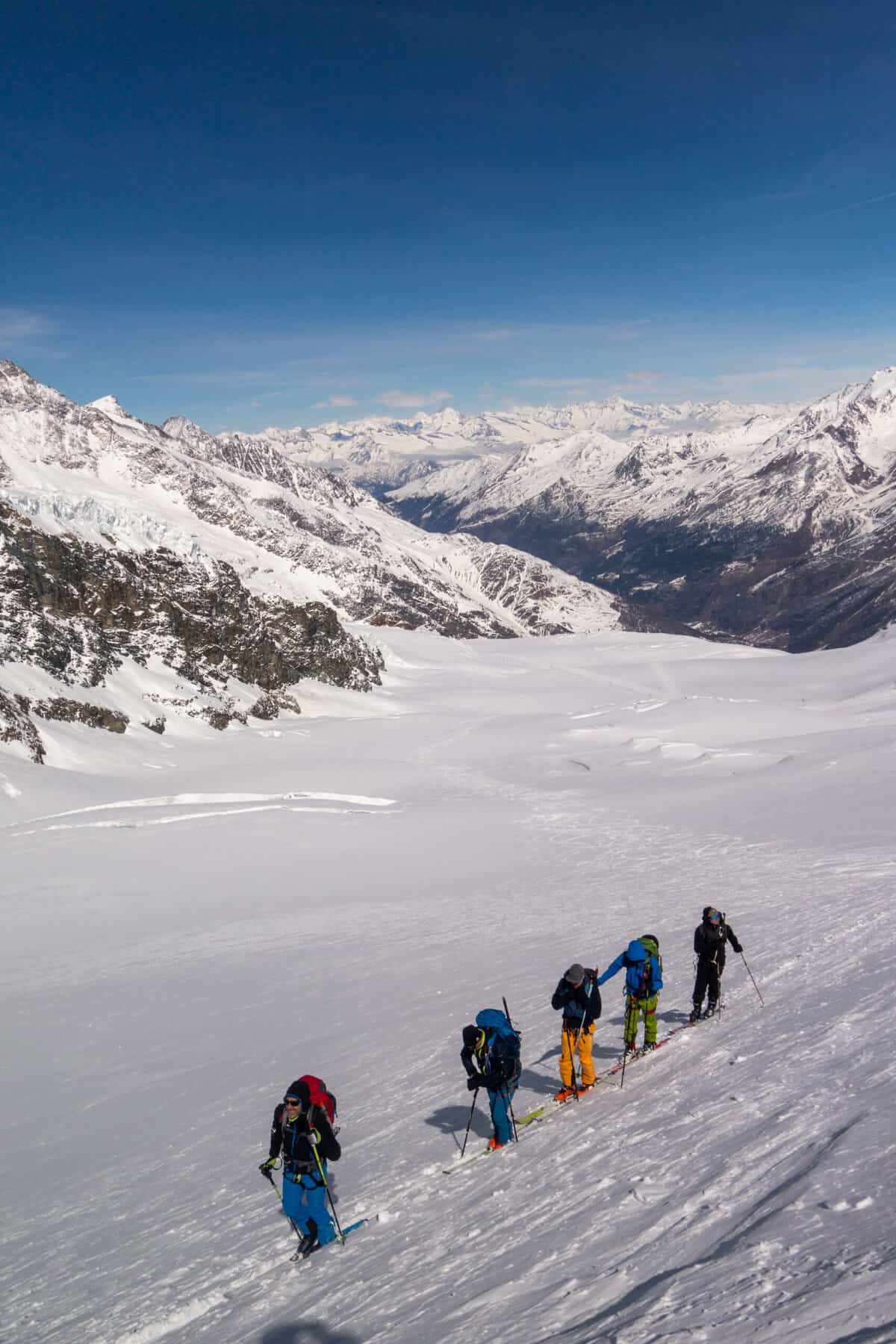 Ski touring and mountaineering on 4000 metre peaks is the best combination. It's simply fun to climb over the snow-covered glaciers at dawn, reach a proud summit and then glide back over the beautiful slopes and flat glaciers. In these 2 days, we will take you on two great ski mountaineering tours to over 4000 metres and show you what to look out for and how to behave on the glaciers and ski mountaineering tours. We meet in Saas-Fee and, thanks to the cable cars, can immerse ourselves in the high mountain world right away and start with the tour to the Allalinhorn. We then spend the night in the beautifully situated Britannia hut. We set off early the next day and head across the wide glaciers to the Strahlhorn. With these good conditions, we can ski down to the Mattmark reservoir after the Strahlhorn. A descent of around 2000 metres awaits us! From there we can take a taxi back to Saas Grund or Saas Fee.