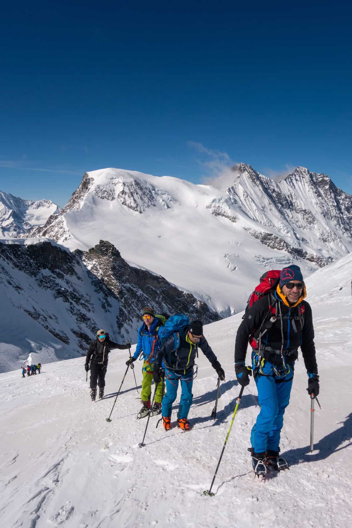Tour to the Strahlhorn. We set off very early and climb over the wide glacier up to the Strahlhorn at over 4000 metres. At the end, a very short and varied scramble to the summit awaits. Descent over the glacier. If possible as far as Mattmark!