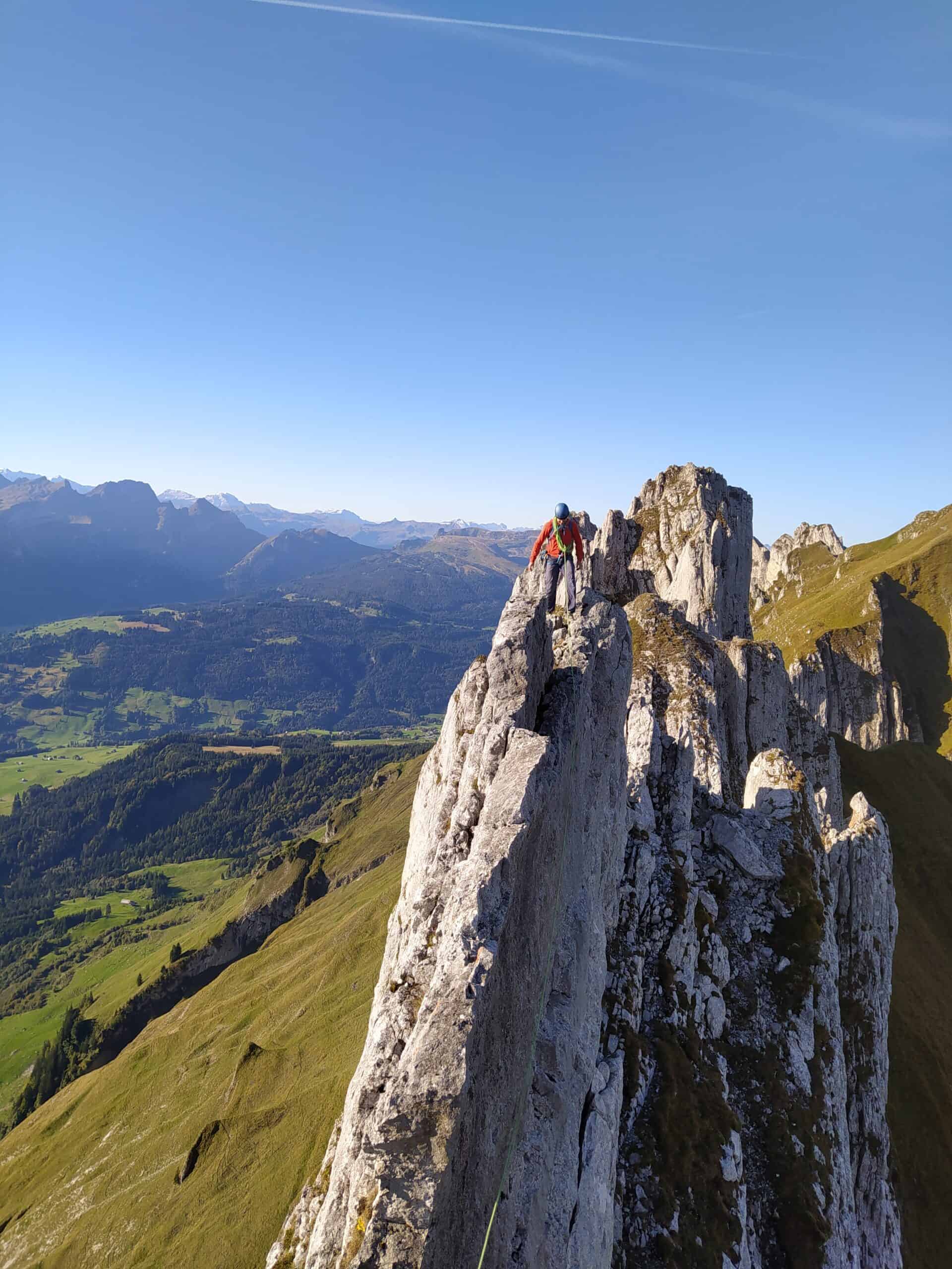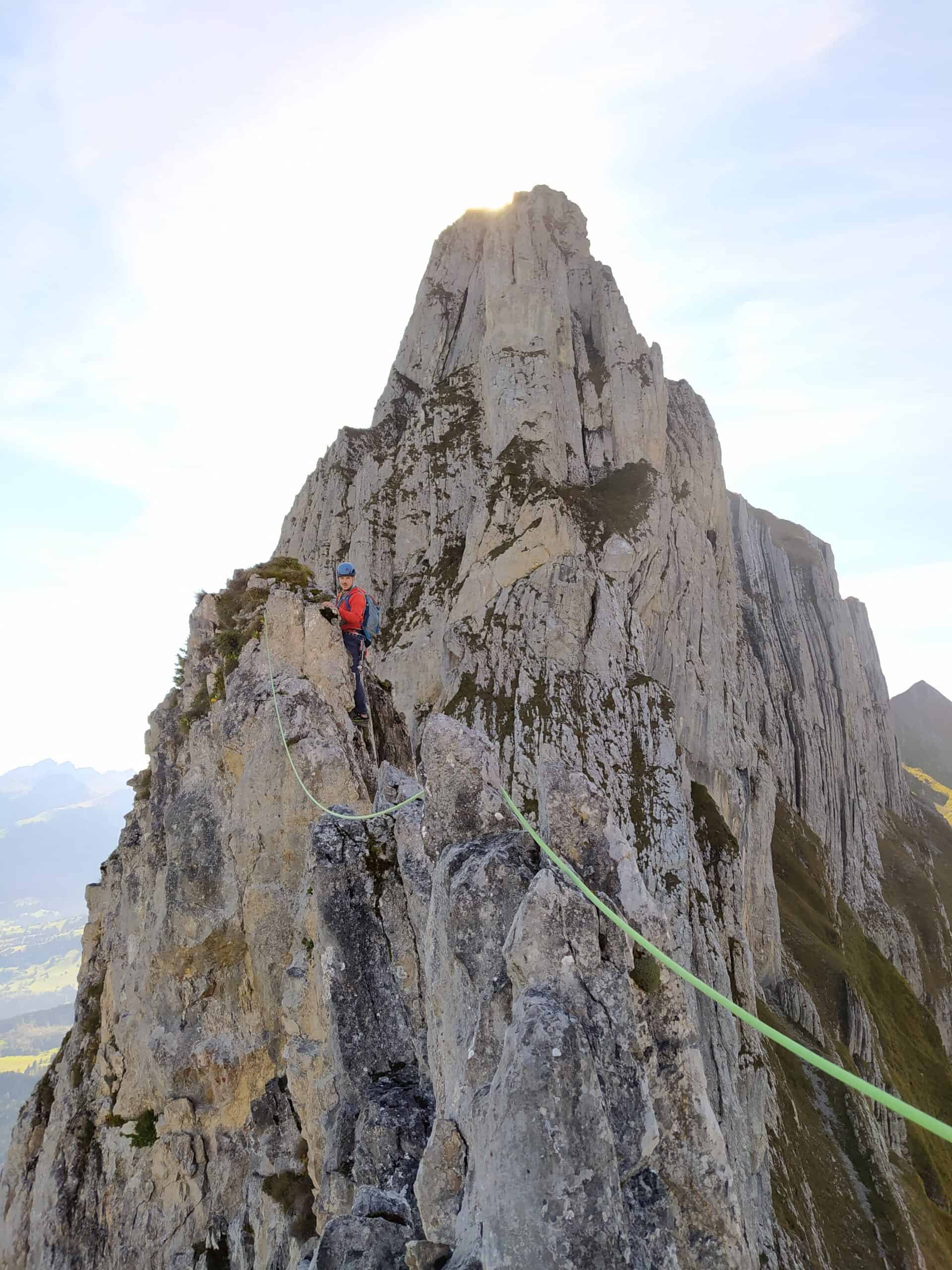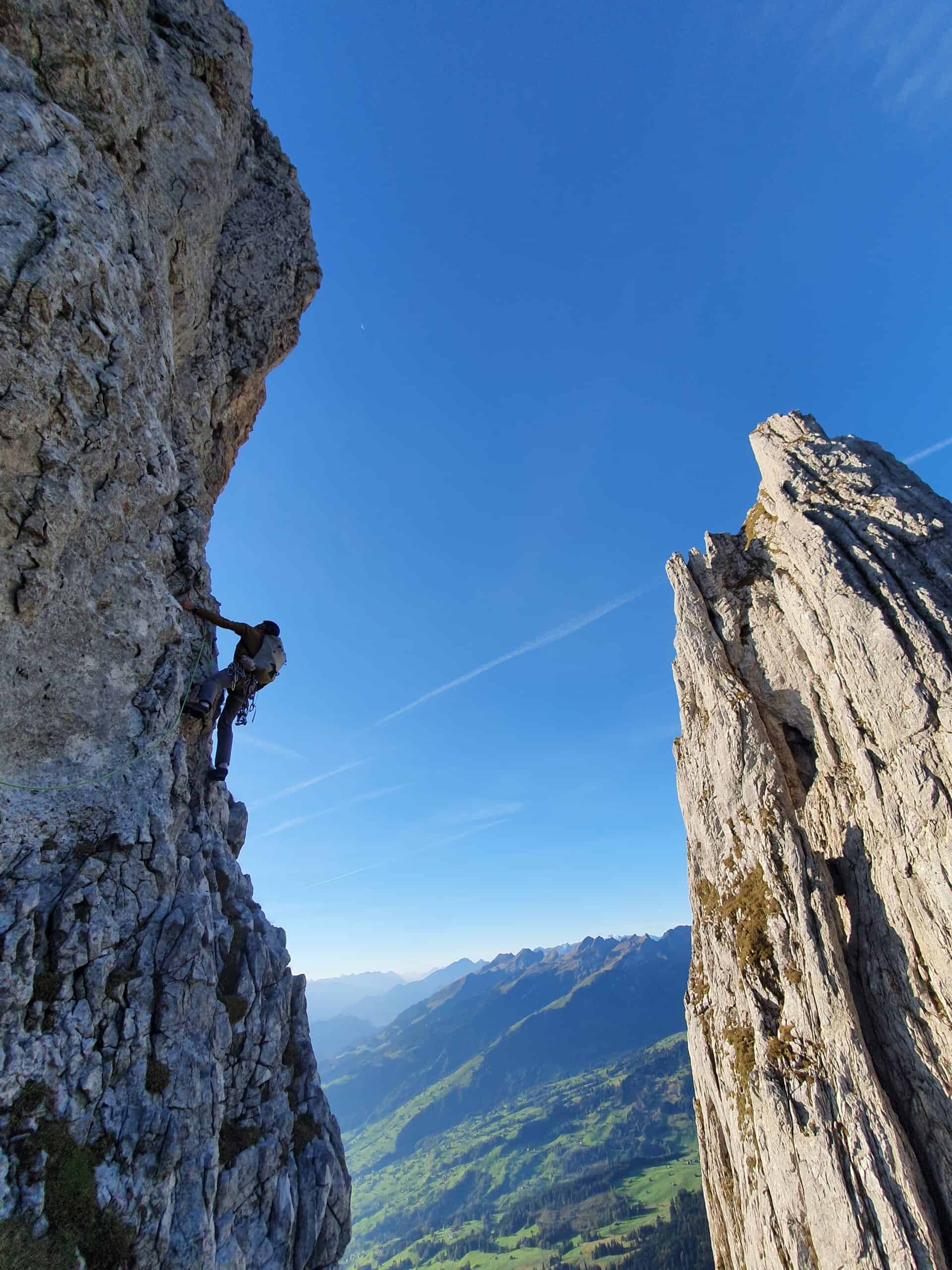 The eight Kreuzberge mountains are impressive limestone towers high above the Rhine Valley. A lot of alpine history was made here! We take on the traverse from the saddle between Kreuzberg VIII and VII and start with the west ridge (3c) on our first Kreuzberg. After abseiling twice, we reach the next notch and from here climb the VI Kreuzberg (4a). The descent leads impressively over the "thumb" to the rock window. The surroundings here are simply brilliant! If there is enough time, we will also tackle the next tower. Once again, excellent ridge climbing in the best rock leads up and, with a few abseils, into the next notch. A very impressive tour, always in adventurous terrain! Depending on the participants, we organise the ascent via Sargans and a car ride to Alp Chapf or by e-bike from Wildhaus.