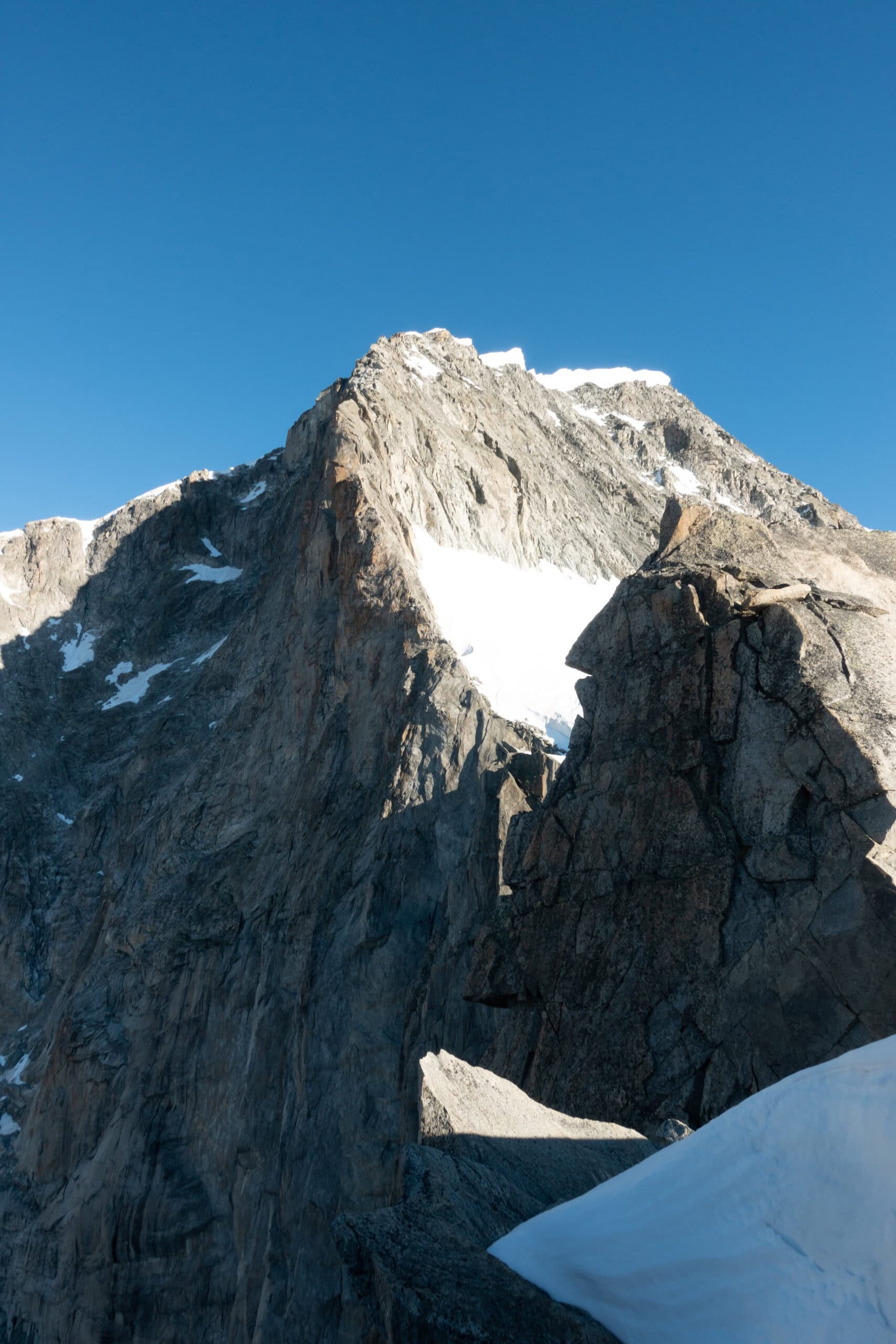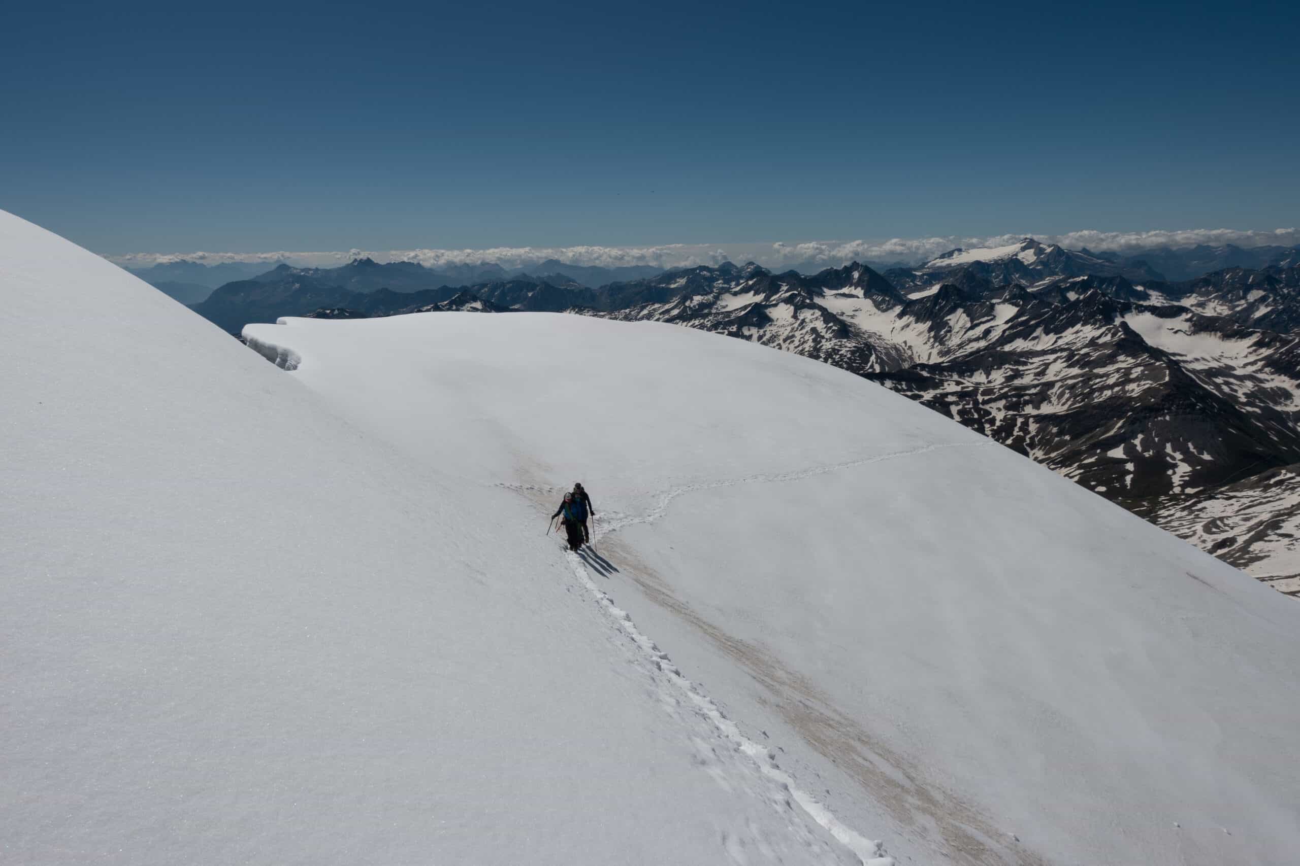 The SE spur leads over the best granite in the third degree of difficulty to the firn ridge. The climbing is varied and easy to do with mountain boots. The firn ridge leads to the summit with crampons.