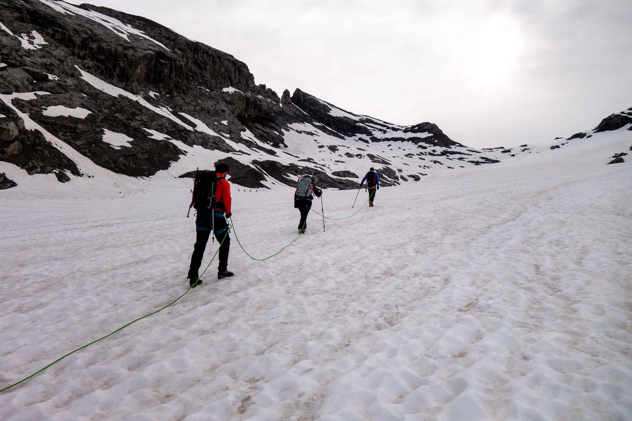 The tour leads over a gentle glacier and an easy but exposed scrambling section to the summit. The tour is a good introduction to mountaineering and includes every facet of alpinism: ascents over green forests and meadows, screey glacier forefield, ice and snow on the Glärnischfirn and a short scrambling section with a summit ridge to Vrenelisgärtli. Even Vreneli wanted to plant a flower meadow on the Glärnisch, and now the striking white summit snowfield, clearly visible from Zurich, is Vreneli's garden. We show you the high tour to the Vrenelisgärtli with lots of fun and insights. We spend the night in the Glärnischhütte, which is perfectly catered for by "Fridli"!