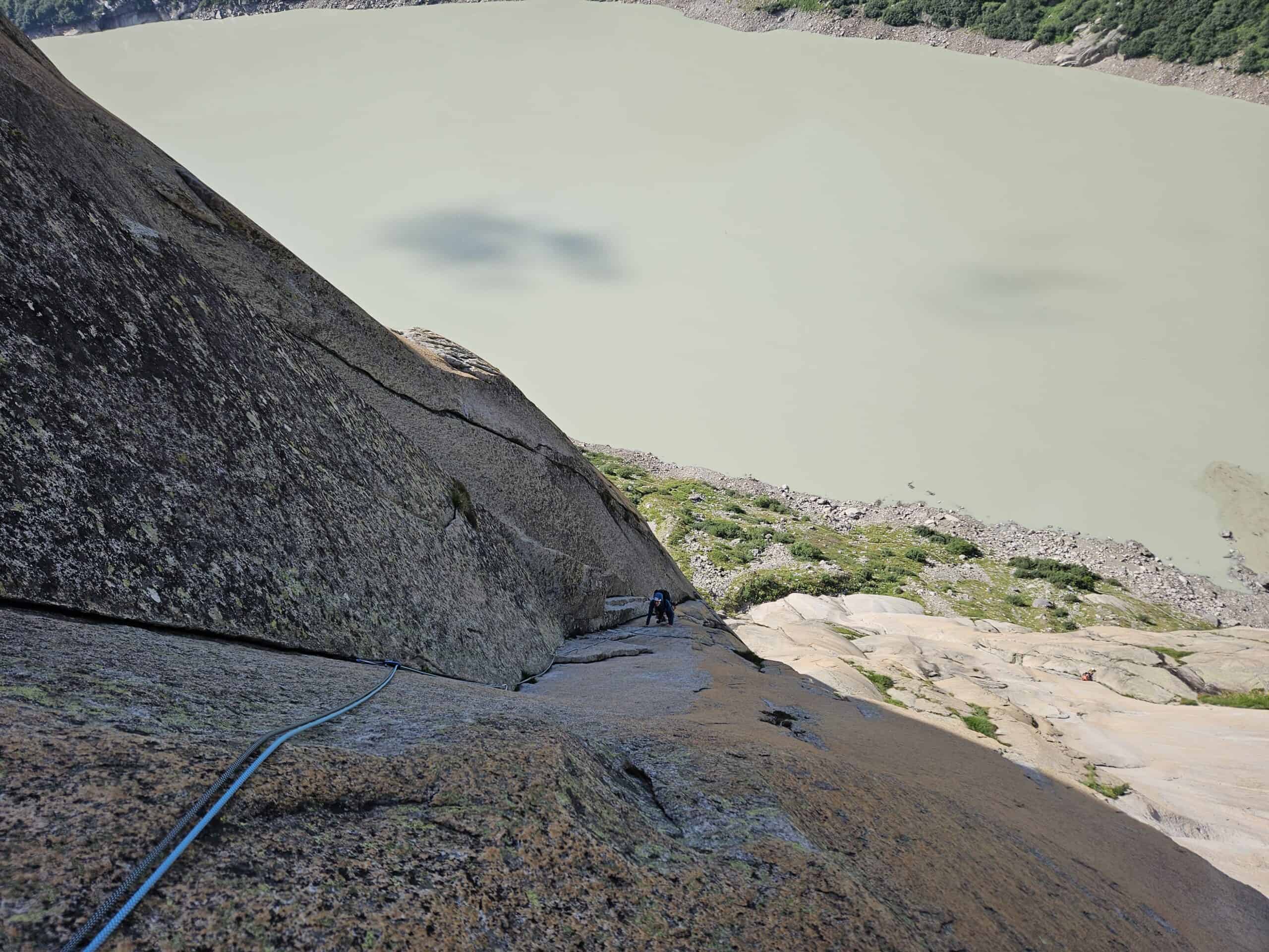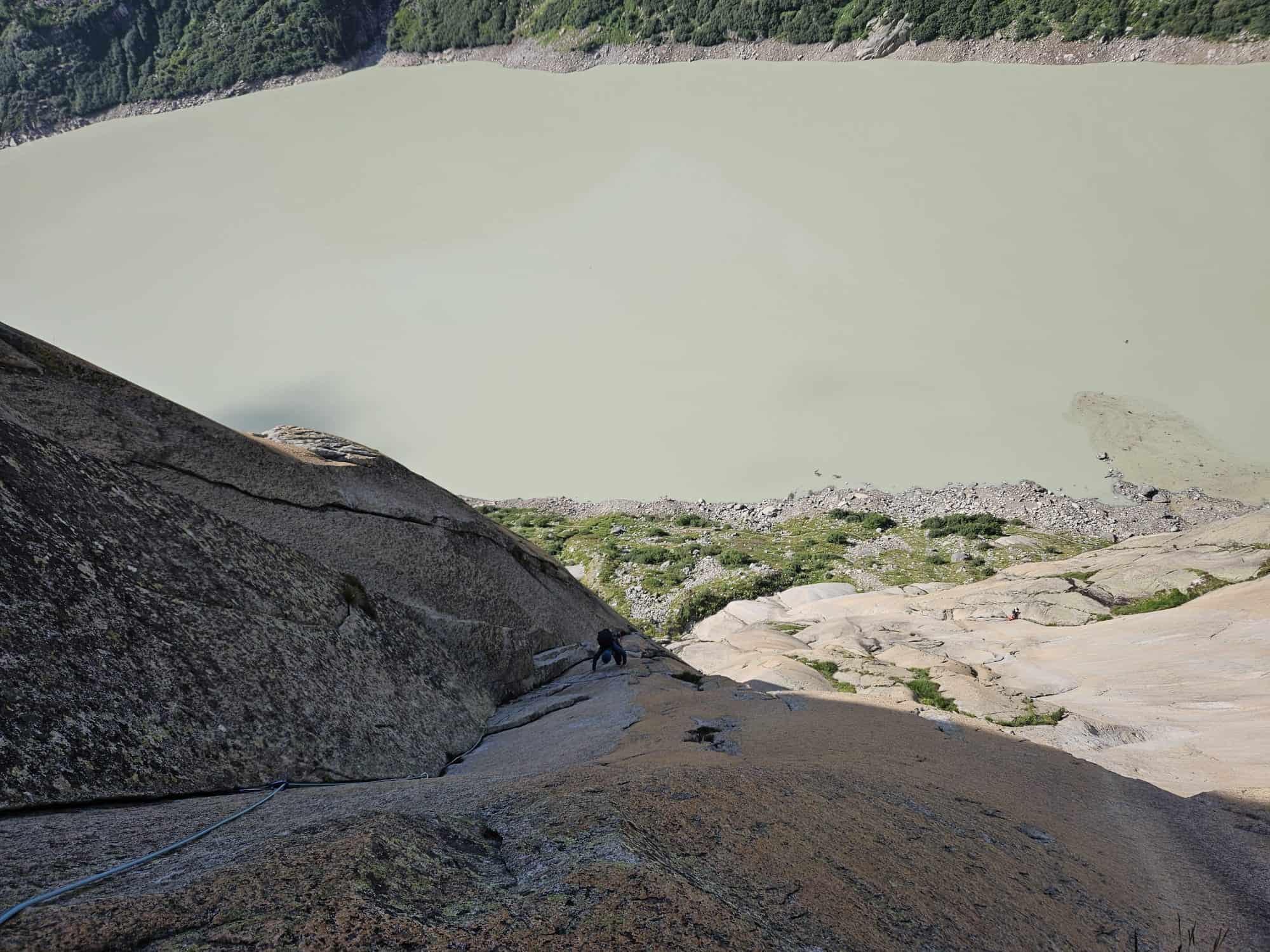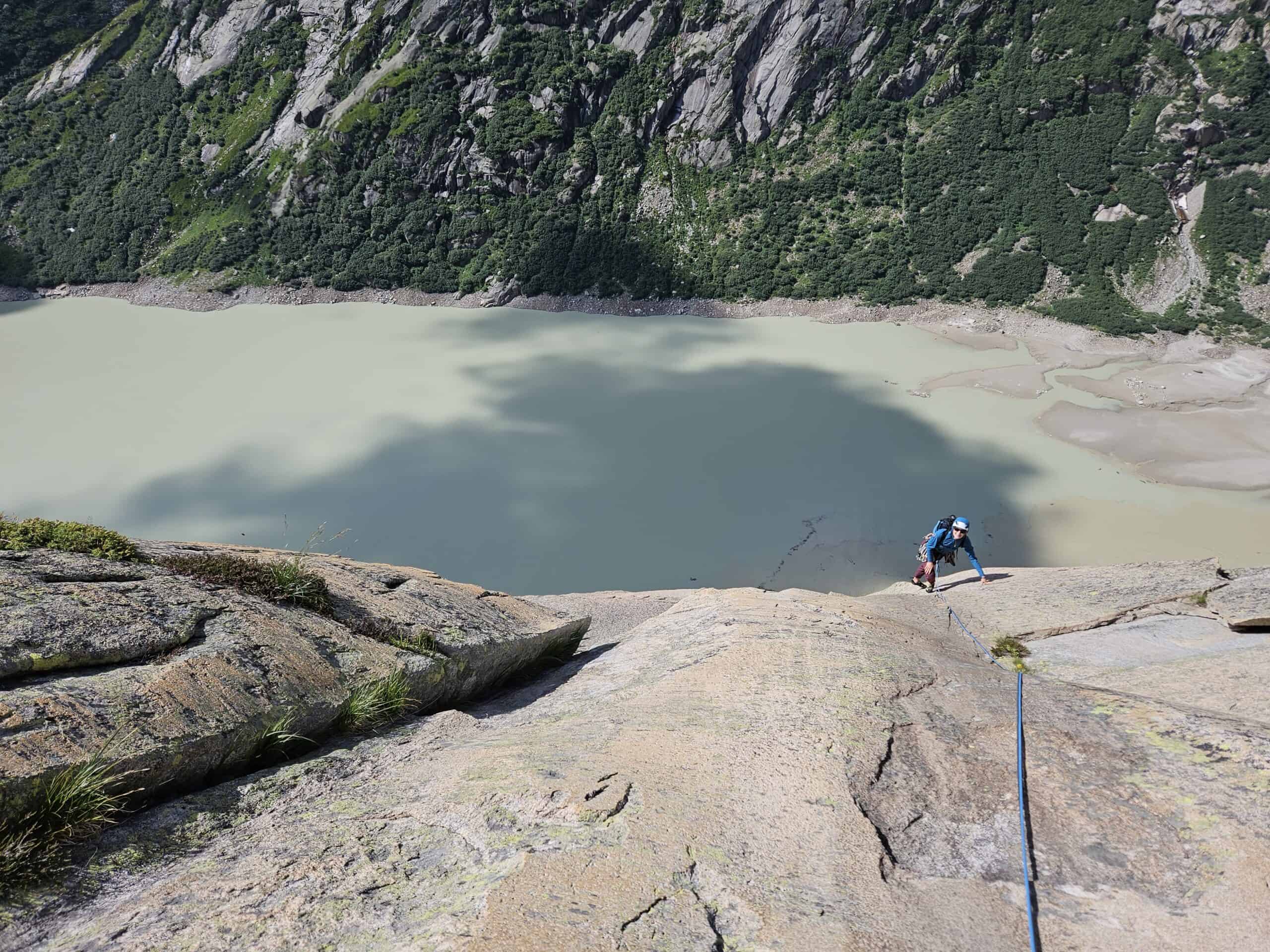 14 pitches of the most beautiful granite await us, always with a view of the Grimselsee and the surrounding, breathtaking landscape.