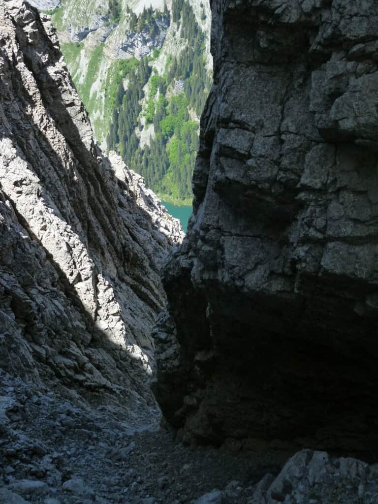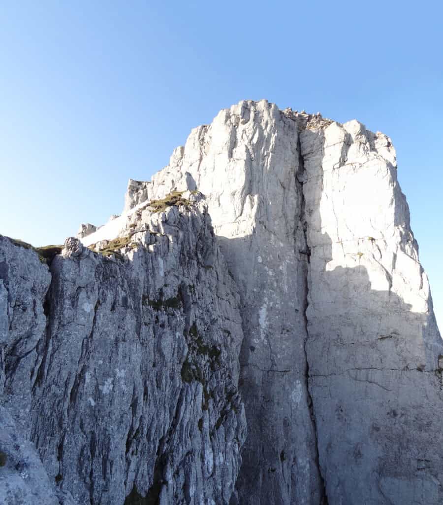 Over grassy slopes and the first rocky steps, we reach striking passages such as the famous Black Schnuer or the Firing rangebefore we venture into exciting climbs. The route leads us over airy ridges, steep chimneys and exposed ledges, always accompanied by fantastic views down into the valley. Highlights include climbing through the compact Finger crack on the stick, as well as the airy ridge passage to Ruchen.