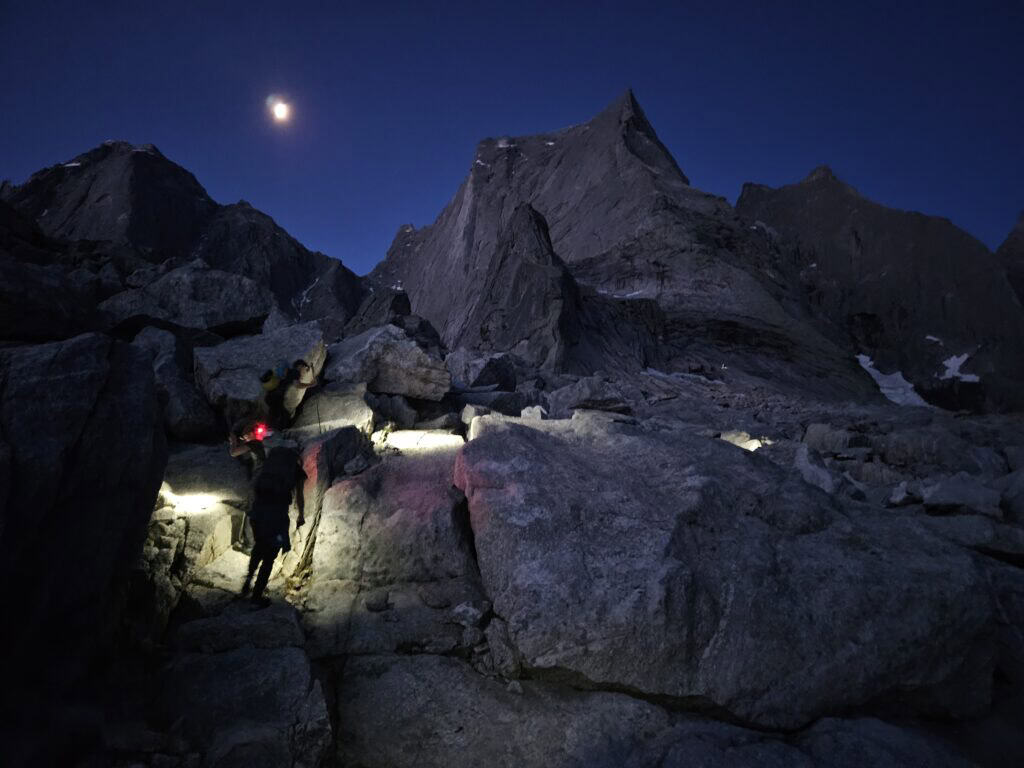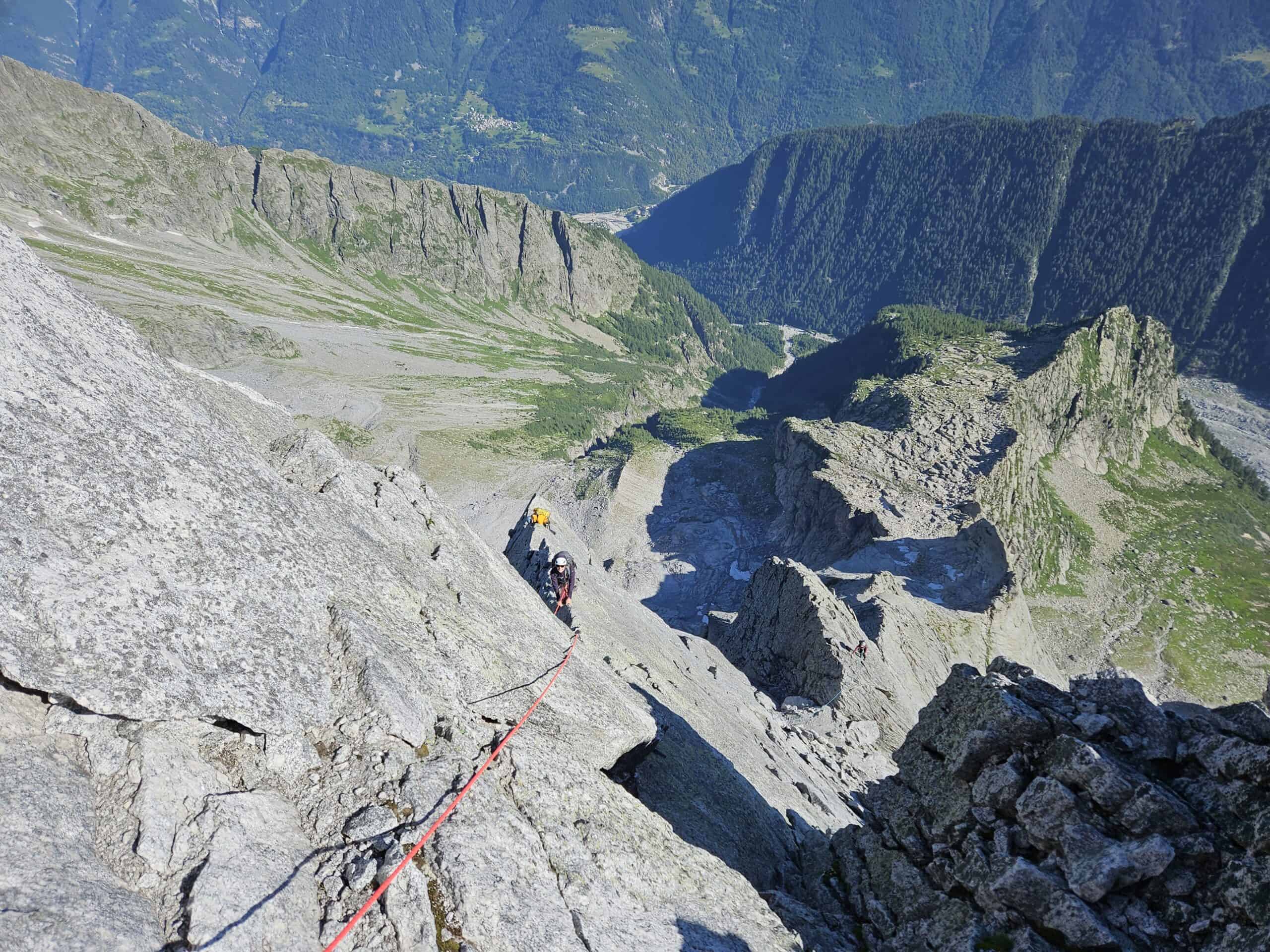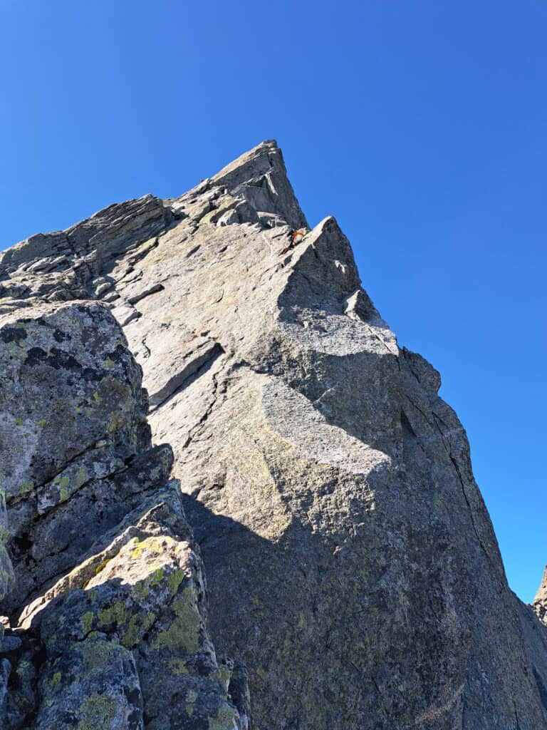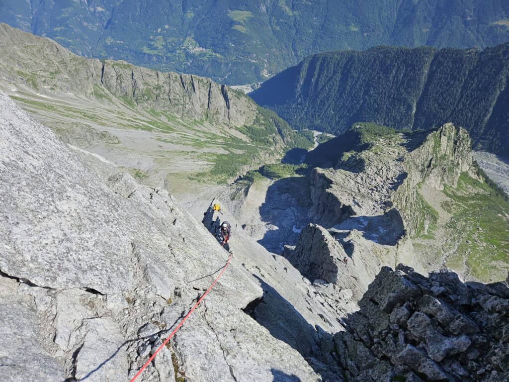On the climbing day itself, we set off early - in the light of our headlamps, we leave the last trees behind us and climb over slabs and boulders to the start. Then the adventure begins: pitch after pitch we follow the clear line of the north edge - always with breathtaking views down into the valley and of the surrounding mountain peaks. Once at the top, we take a break and enjoy the view.