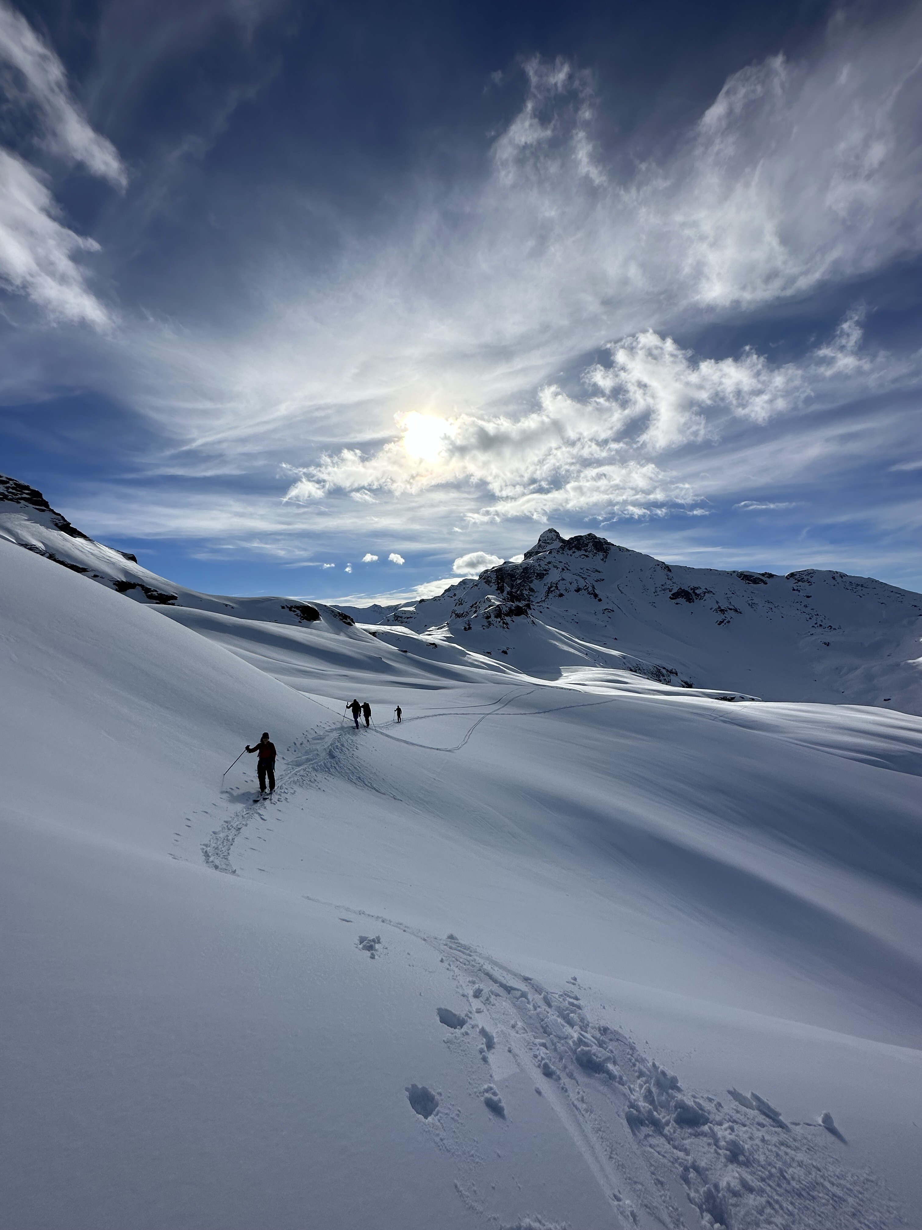 It has once again snowed all the way down to Elm and so we set off on a great tour from the Elm ski area. Sunny ascents and beautiful descents await us. The terrain is great and we can enjoy the beautiful snow this week. After so much downhill skiing, we don't mind carrying our skis for the last few metres into the valley. The Elm cable cars carry us up and so we can start our ski tour at over 2000 metres (tour ticket 21.-). We undertake an exciting traverse around the Bliistock with beautiful descents and a few cool passages. In about two ascents we cross the hinterland of Elm to finally descend into the valley. A taxi picks us up here and takes us back home, full of joy.