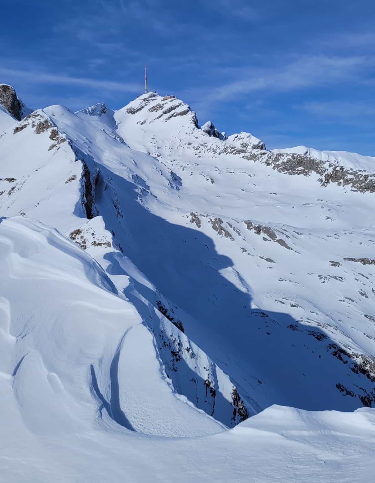 Grandiose tour around the mountain in eastern Switzerland: imposing limestone cliffs, lots of downhill skiing and playful terrain - finally with some fresh snow!