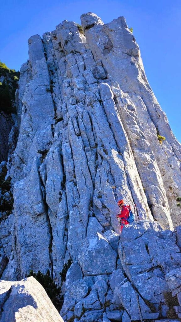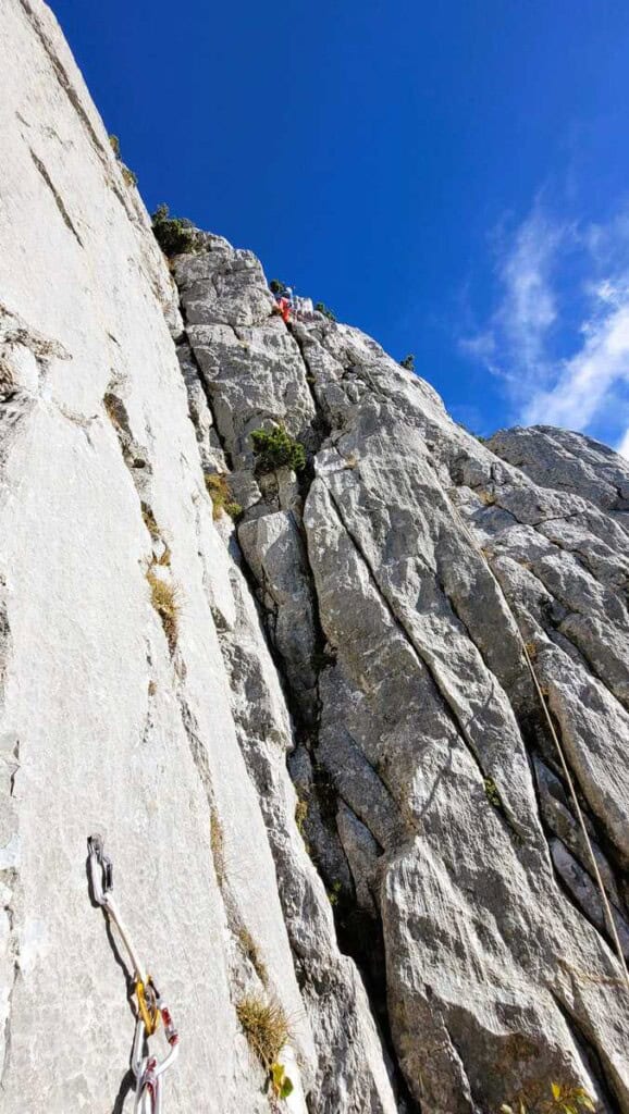 Abwechslungsreiche Klettertour in griffigem, scharfem Kalk: Klettern, Kraxeln und Abseilen.