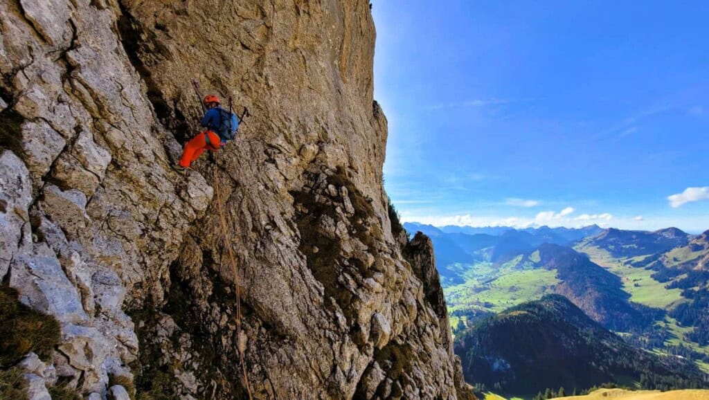 Erlebe eine genussvolle Klettertour über die Schafbergkante oberhalb von Wildhaus, ein echter Klassiker im Toggenburg! Die Route verläuft über griffigen Kalk und bietet abwechslungsreiche Kletterei grösstenteils im 4. Schwierigkeitsgrad, perfekt geeignet auch für Zustiegs- oder leichte Bergschuhe. Die kurze Schlüsselstelle im 5. Grad meistern wir gemeinsam mit gezieltem Coaching durch unseren kompetenten Bergführer. Der Tag steckt voller Erlebnisse: Schon der Zustieg mit der kleinen Bahn ist ein Highlight, bevor wir in der Dreierseilschaft über die luftige Kante steigen. Die alpine Kletterei, die super Felsqualität sowie das abschliessende Abseilen machen diesen Tag zu einem unvergesslichen Abenteuer. Während der Tour begleiten uns grandiose Ausblicke auf die Churfirsten und das Säntismassiv, die immer wieder zum Innehalten einladen.