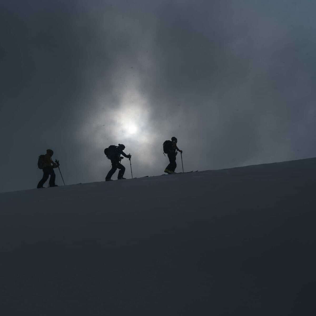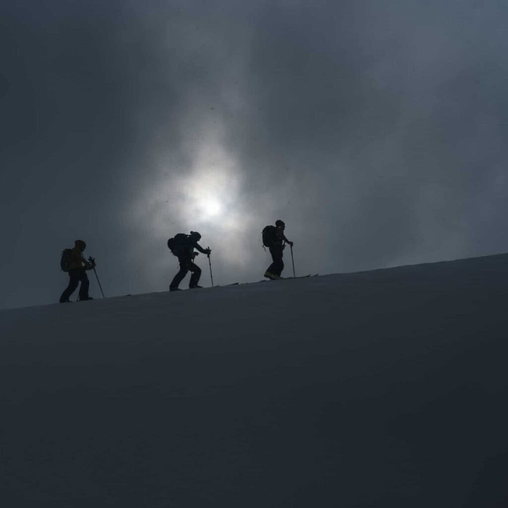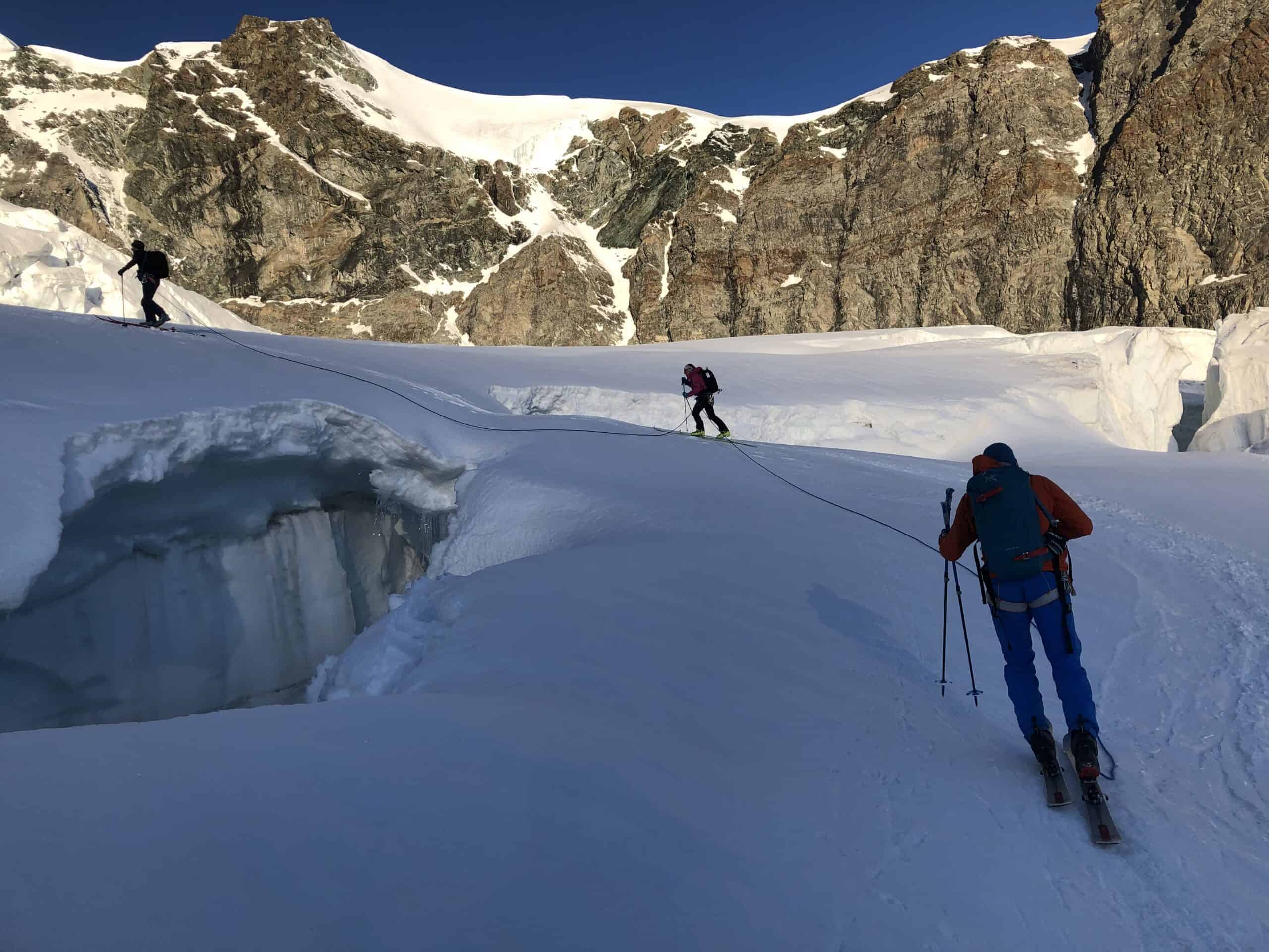 Would you like to get to know the high mountains on skis, but have no experience with ropes, crampons or glaciers? In this preparatory course, we will teach you the most important basics for safe high-altitude ski tours. Together we will practise how to walk correctly with crampons, how to use an ice axe and rope and how to carry your skis efficiently on your rucksack. To gain further experience, we also ski down a short and steep section with rope support. This will give you the confidence you need to take part in guided high-altitude ski tours and Haute Routes in the Alps and experience your first 4,000 metre peaks on skis.