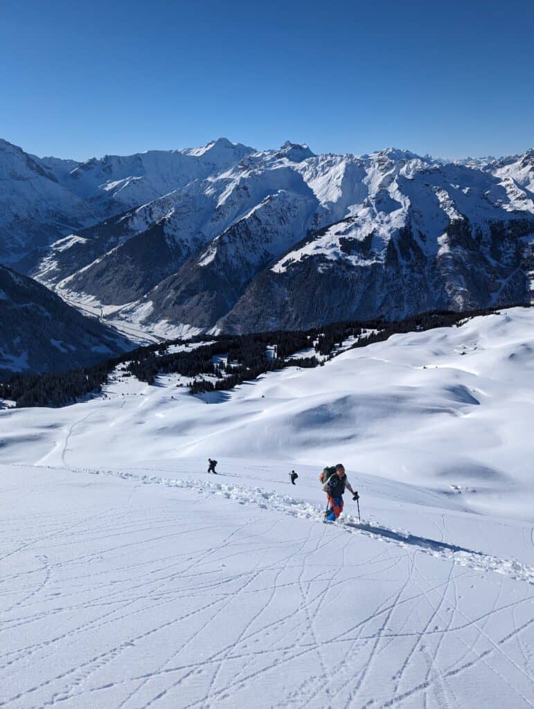 - Mastering the ski touring technique with its basics (skins, hairpin turns).
