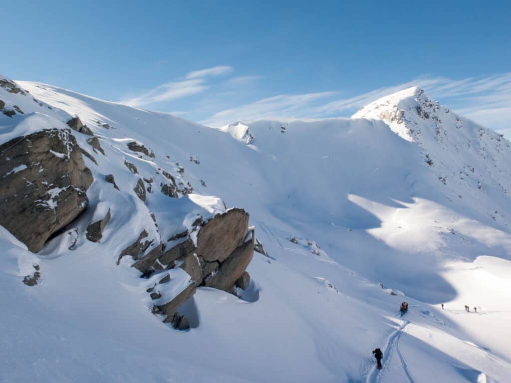 Thanks to the Lauchernalp mountain railway, we start comfortably at altitude and use the first stage for rewarding descents from the ski area. Little ascent and lots of descent!