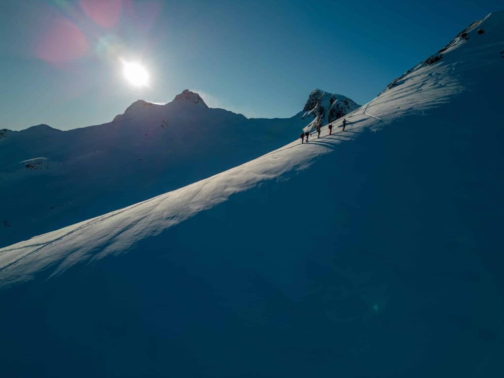 - Mastering the ski touring technique with its basics (skins, hairpin bends). These are often normal ski tours, as we know them from Switzerland. If possible, we also include tours with passages where we tie on the skis or a foot ascent is included.