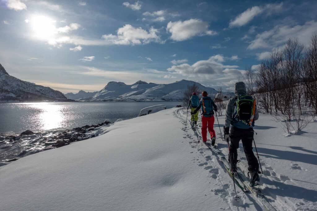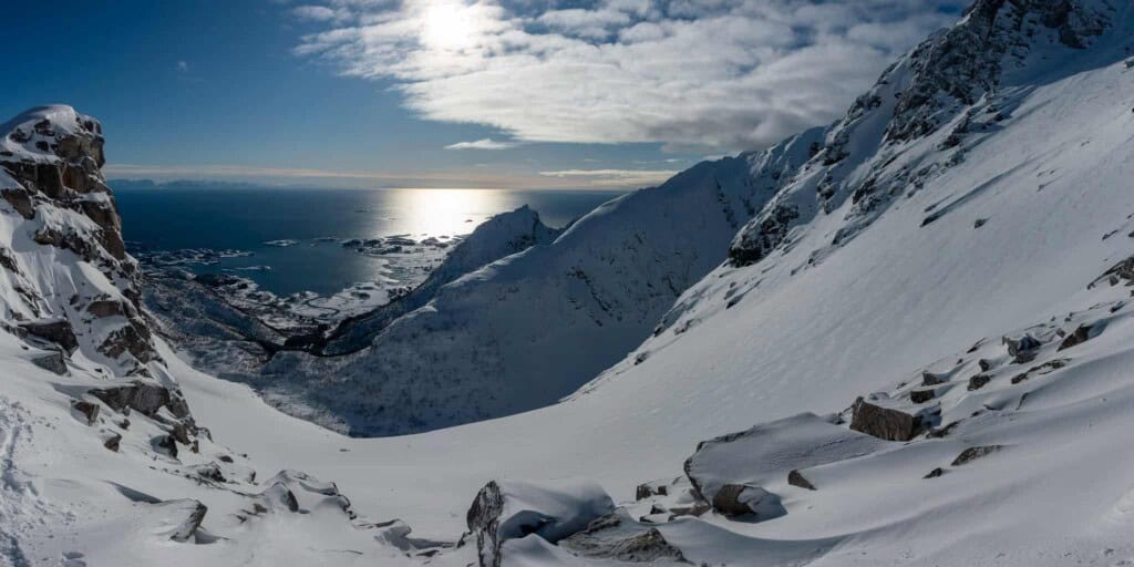 The weather in the Lofoten Islands is varied and can change quickly. Within a few days, stable high-pressure conditions with sunshine and little wind are just as possible as stormy snowfalls and rapid weather changes. The proximity to the sea ensures comparatively mild temperatures for these latitudes - the thermometer is usually around -10 °C, occasionally milder. Wind is a frequent companion and should always be taken into account when planning a tour. Overall, flexibility and good preparation are key to making the most of the changeable conditions.