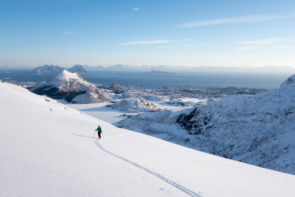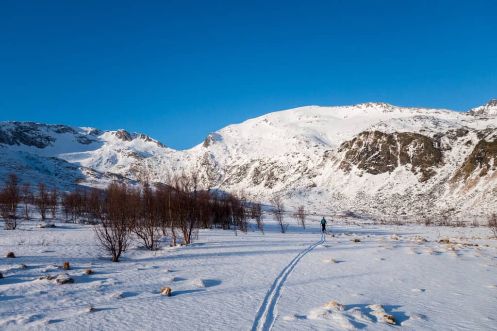Norway's landscape is characterised by the branching coastal region with its fjords. Directly from the sea, the mountains rise. Often the mountains on the coast are so steep that it is easy to ski. But there are also imposing rock faces. The lower part is often covered with open birch forests. However, these birch trees are only about 3 m high. They offer enough protection and contrast to enjoy the fresh powder snow even in bad weather. The mountains are about 800 to 1200 m high, so that varied ski tours with crossings can be put together.