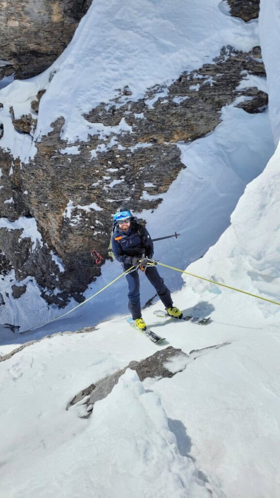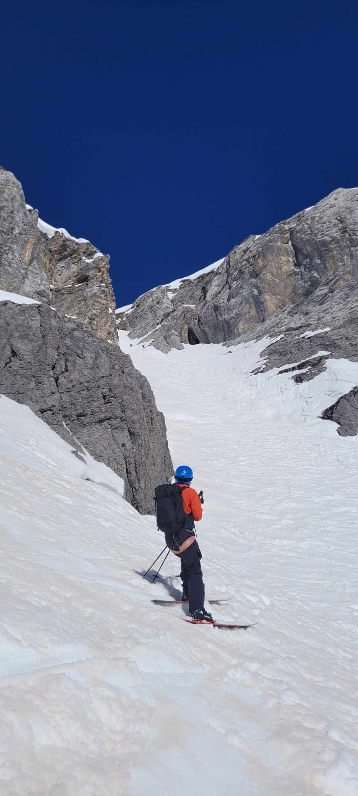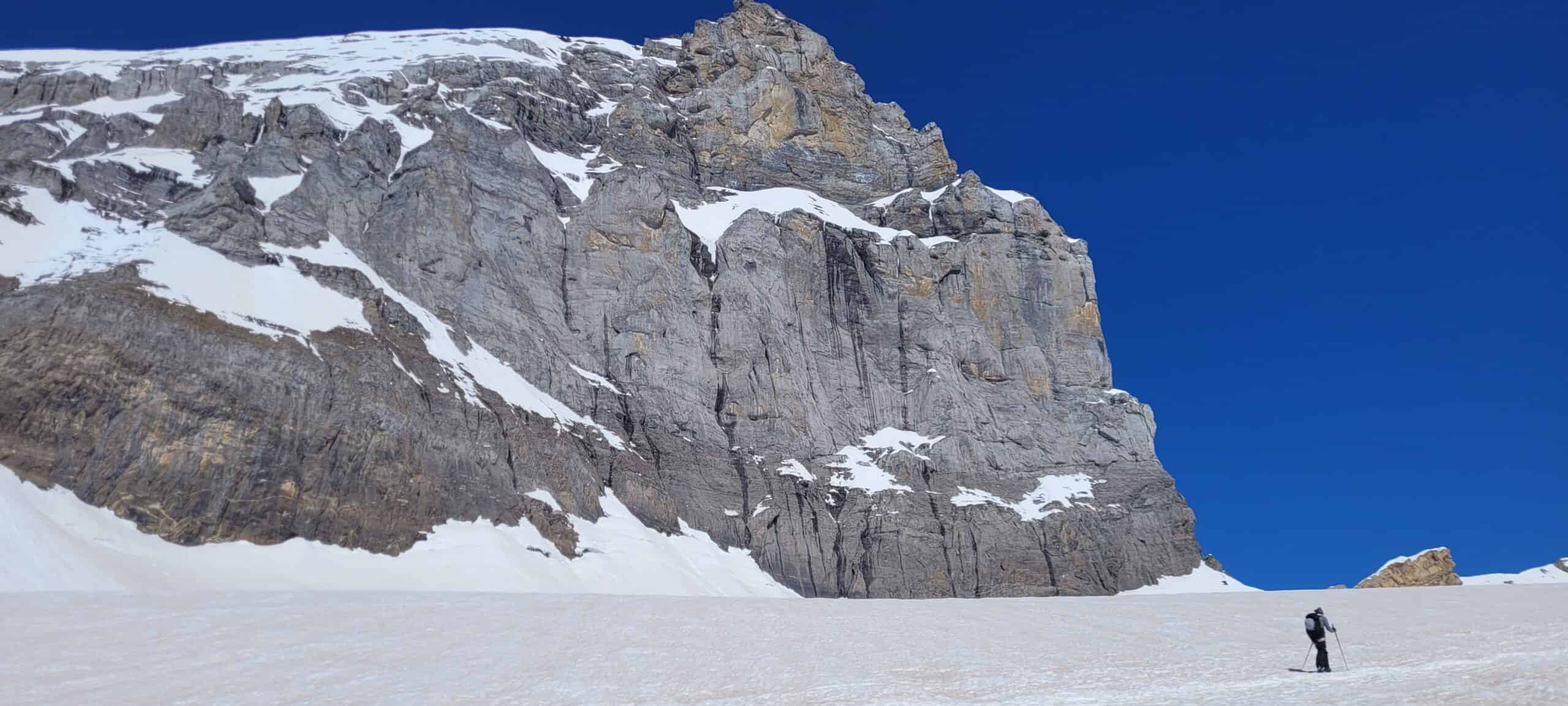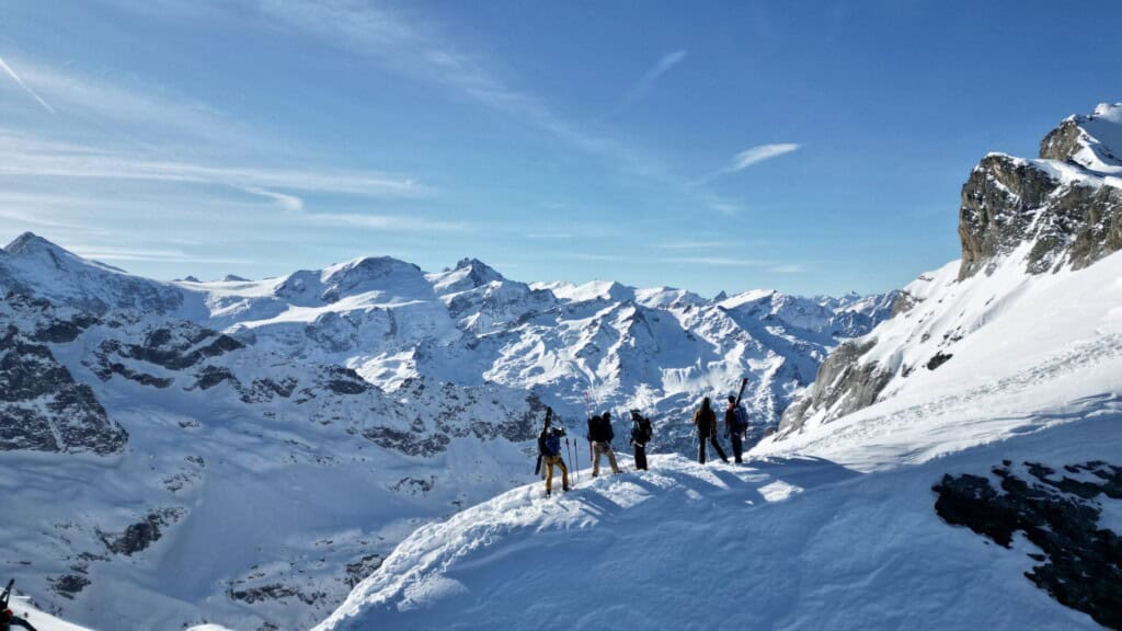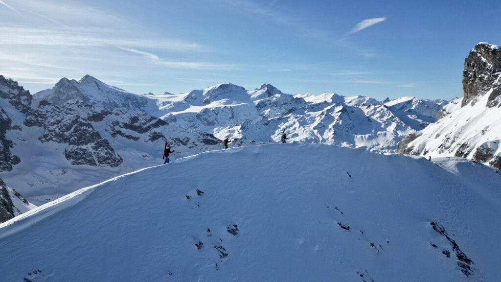 After the fresh snow on Thursday and Friday, we're going on this tour together! The Titlis round tour takes us through impressive high mountain terrain. First we abseil twice with skis on our feet through the south face couloir to reach the foot of the south face. The tour continues with a leisurely ascent and two long descents past the Grassenbiwak, around the Titlis and back to Engelberg. This involves a comfortable 600 metre ascent and a sporty 2000 metre descent. Together and well coached by our local mountain guide Sven, you can experience and enjoy the tour to the full.