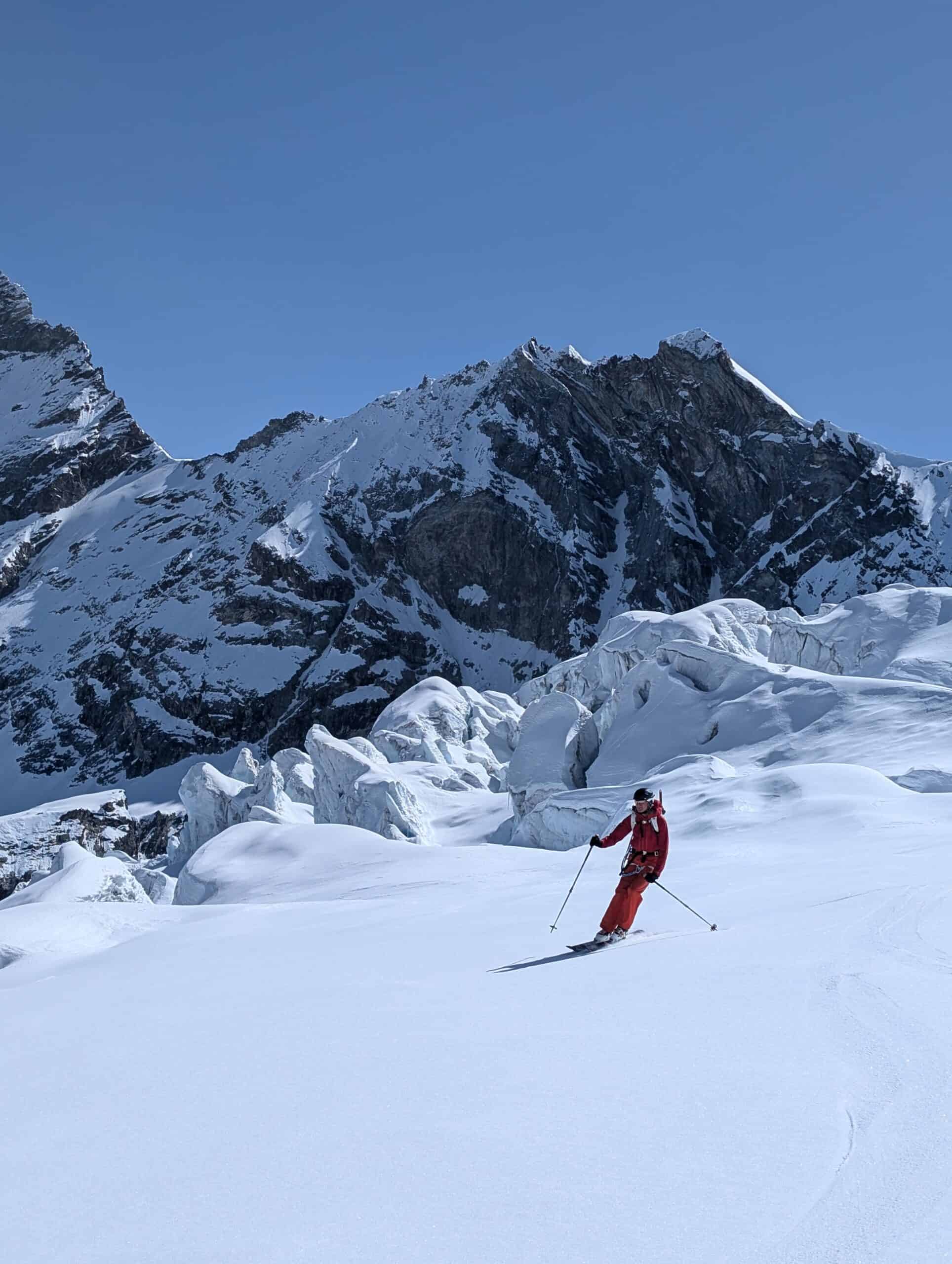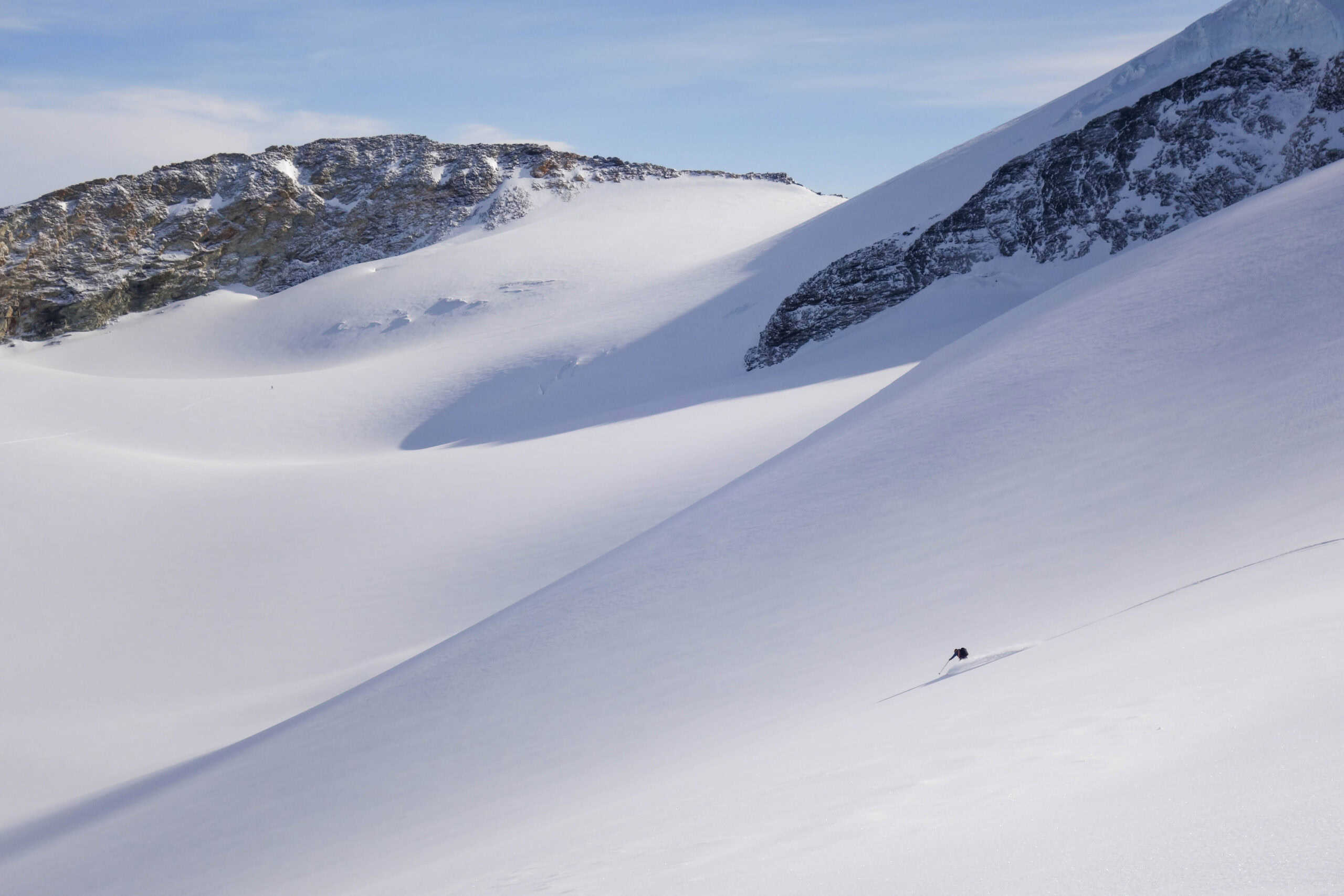 Another highlight! The day starts with a descent over the Turtmann Glacier past the Turtmann Hut. From here we cross two small passes where we put on our skis both times to get up. Small couloirs or gullies lead down the other side. Finally, we reach the Wasuhorn, from where we tackle a long descent to Jungu. A really varied day. In Jungu we take the small cable car to get back to the main valley.