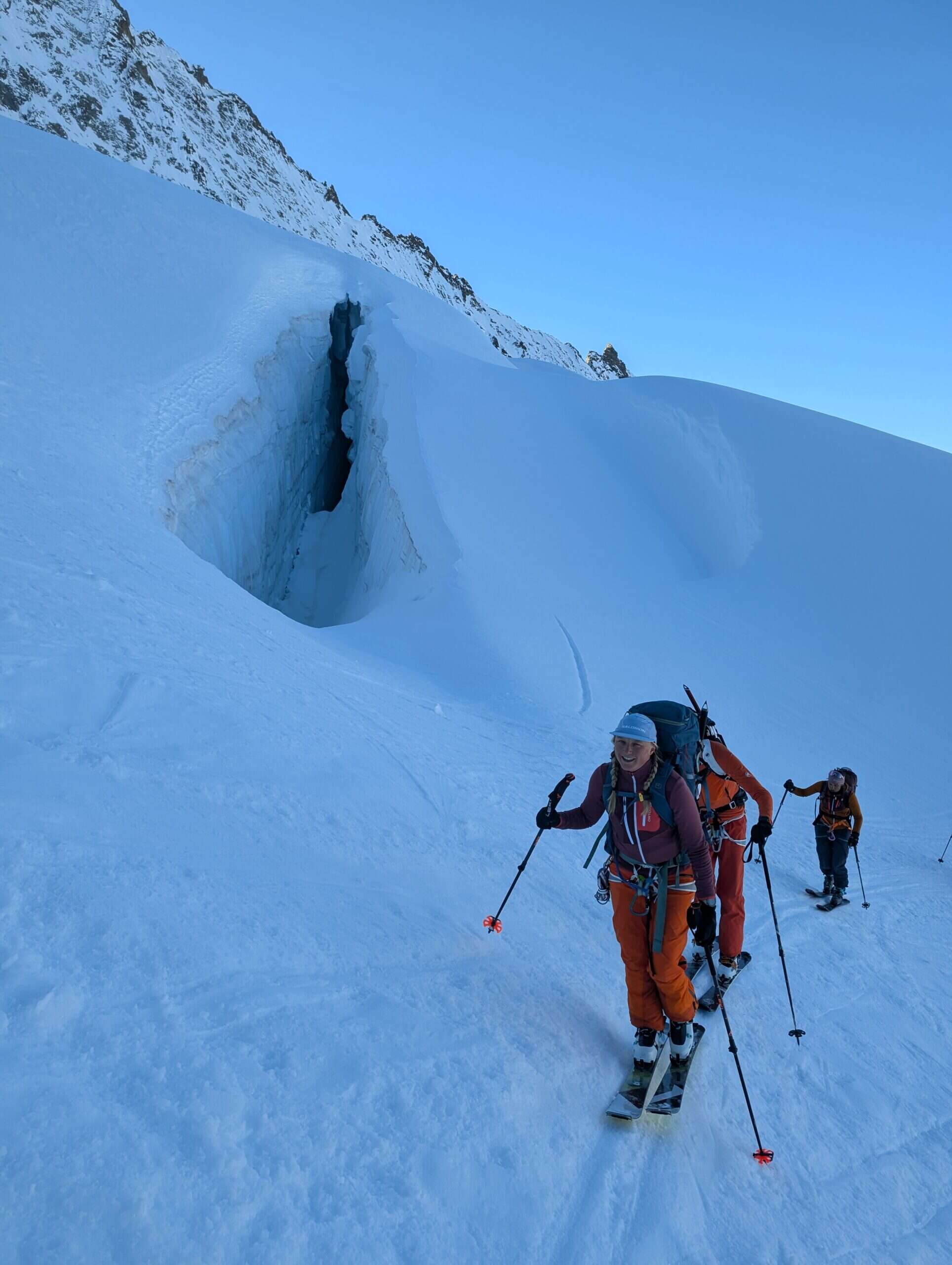 A longer ascent takes us over the Hohwäng Glacier to Col Durand. Here we enjoy a magnificent view of the Matterhorn and the Monte Rosa massif until we slide or descend more steeply on the other side. Depending on the conditions, we may need a fixed rope here. We continue with a spectacular descent over the rugged Glacier Durand and a short ascent to the Cabane du Mountet. A first full day of touring and full of impressive first impressions.