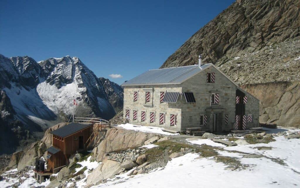 The Tracuit hut (3,256 m) is perched spectacularly on a rocky ridge between the Turtmann valley and the Bishorn - with a direct view of the majestic peaks of the Valais Alps.