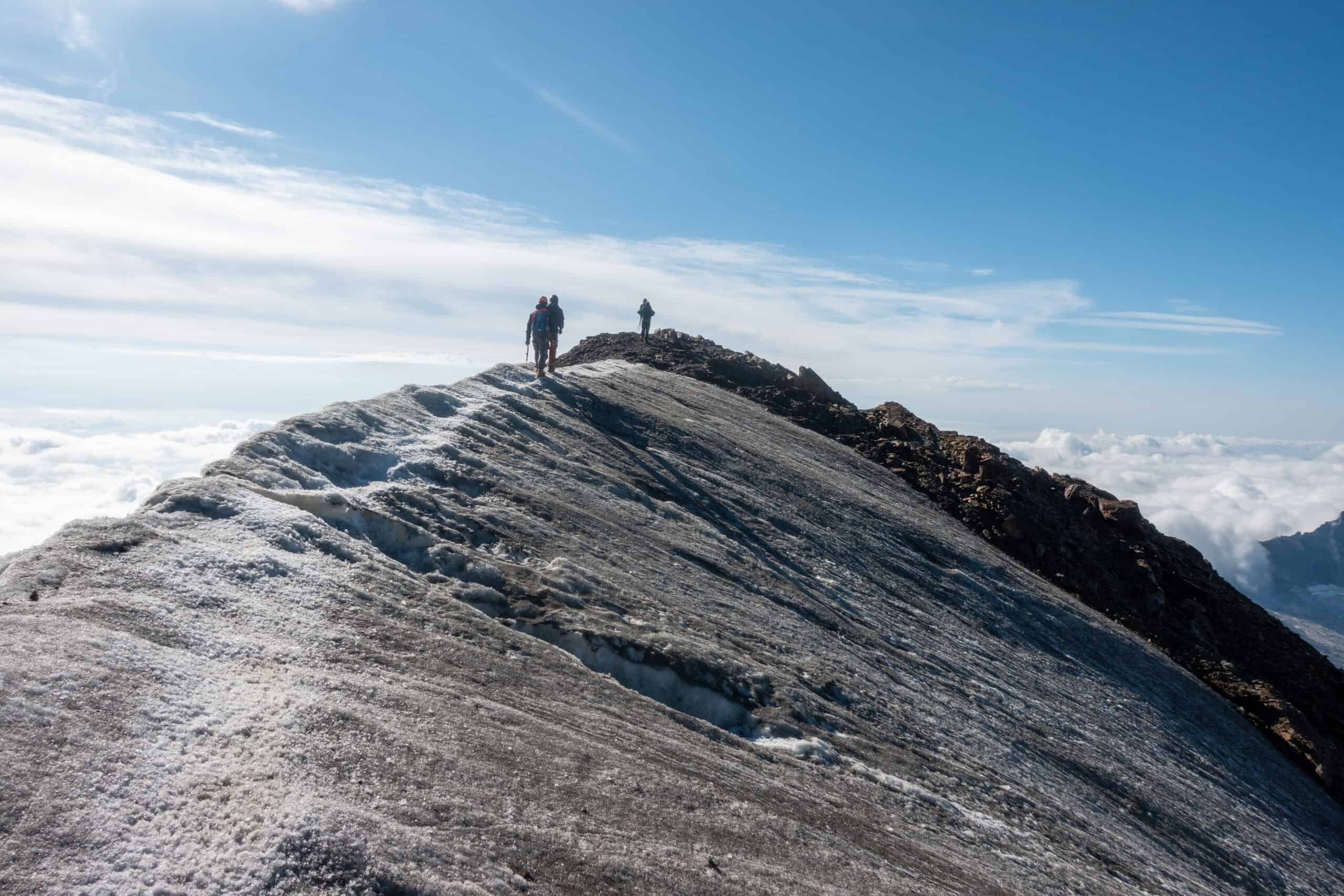Today the crossing is on the programme. We start in the dark to experience the magnificent sunrise on the Zwischenbergenpass. From here, the route continues somewhat pathless until we reach the start of the south ridge of the Weissmies. We reach the beautiful and easy block ridge, the actual south ridge of the Weissmies. On the pre-summit, we switch to crampons and climb over the firn ridge to the main summit. Here we enjoy the marvellous view of the many 4,000 metre peaks of the Valais. The descent is via the impressive glacier to the Hohsaas cable car, where we can toast the tour and then take the cable car back down to the valley in comfort. Finish: approx. 15.00 in Saas Grund.