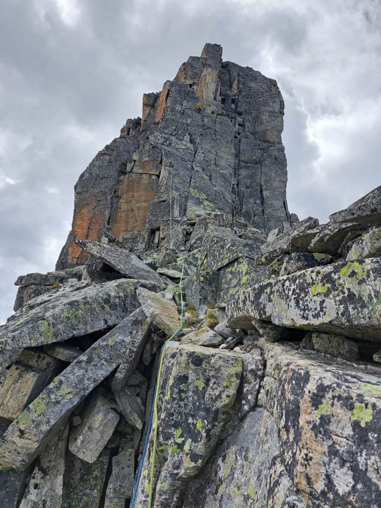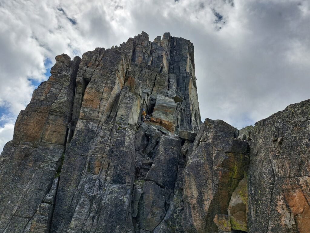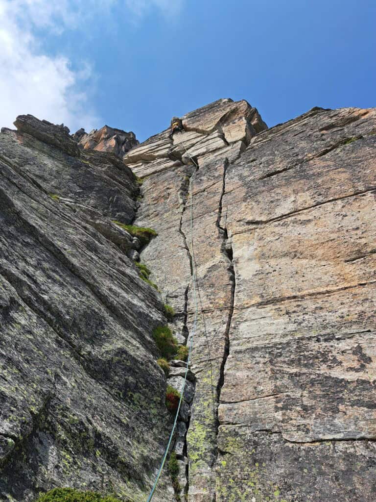 The rock surprises with fantastic friction, good holds and varied routes. In nine pitches, we move elegantly and with a steady flow towards the north summit - never extremely difficult, but consistently exciting, airy and rewarding.