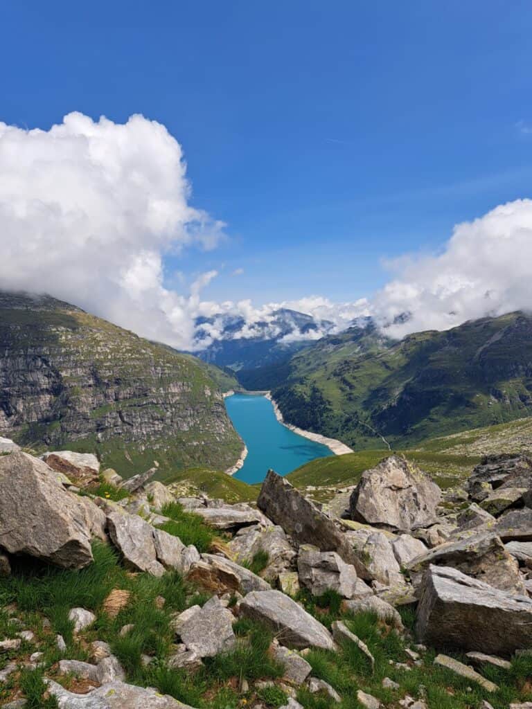Once at the top, we are rewarded with a magnificent 360° panorama: the view sweeps over the Valsertal valley, the deep blue reservoir and the peaks all around - a perfect place for a short break, to take a deep breath and marvel. The descent is via the Nanouk route, abseiling back to the foot of the wall, then on foot and possibly by bike back to the starting point. Finally, we enjoy a cool drink in one of the cosy inns in Vals and reflect on the tour.